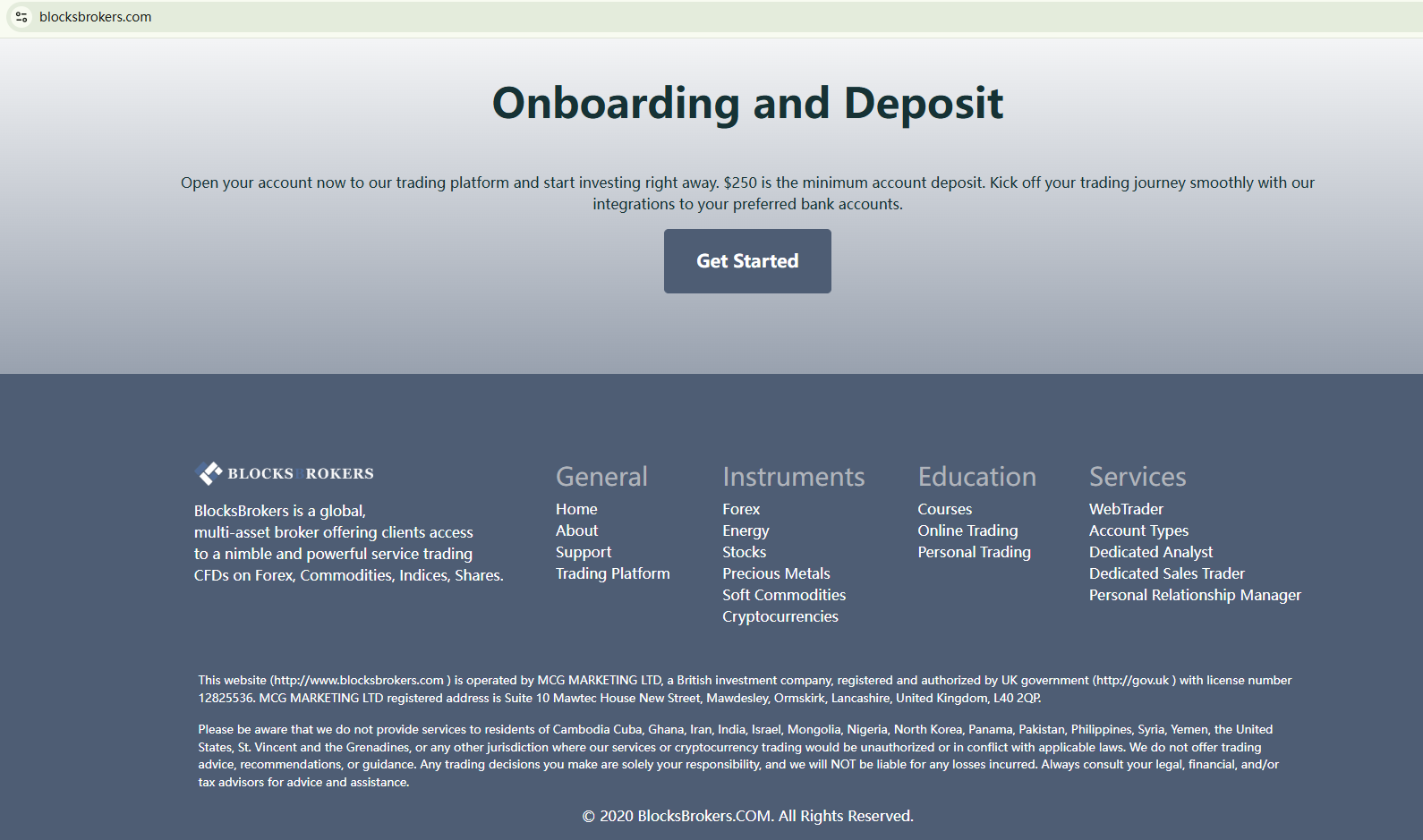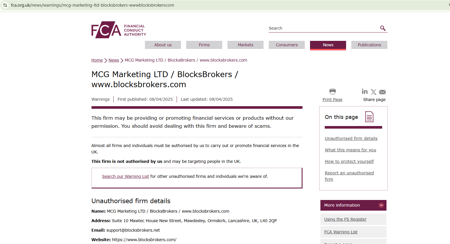 BlocksBrokers claims to be operated by a company called MCG MARKETING LTD, which purports to be domiciled and authorized in the UK. However, the Financial Conduct Authority (FCA), a major British financial regulator, has issued a warning about the company, noting that it is not authorized by them and advising investors to stay clear of this potential scam.