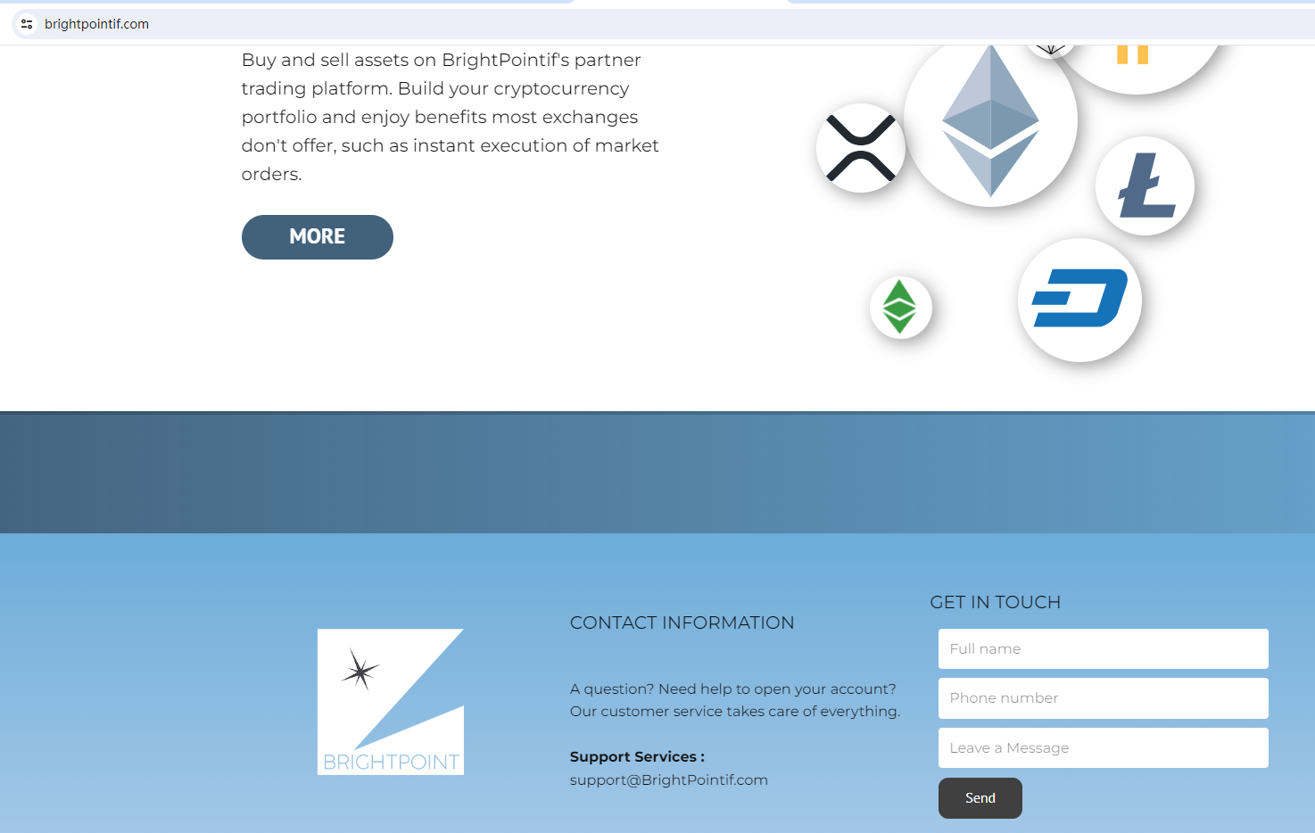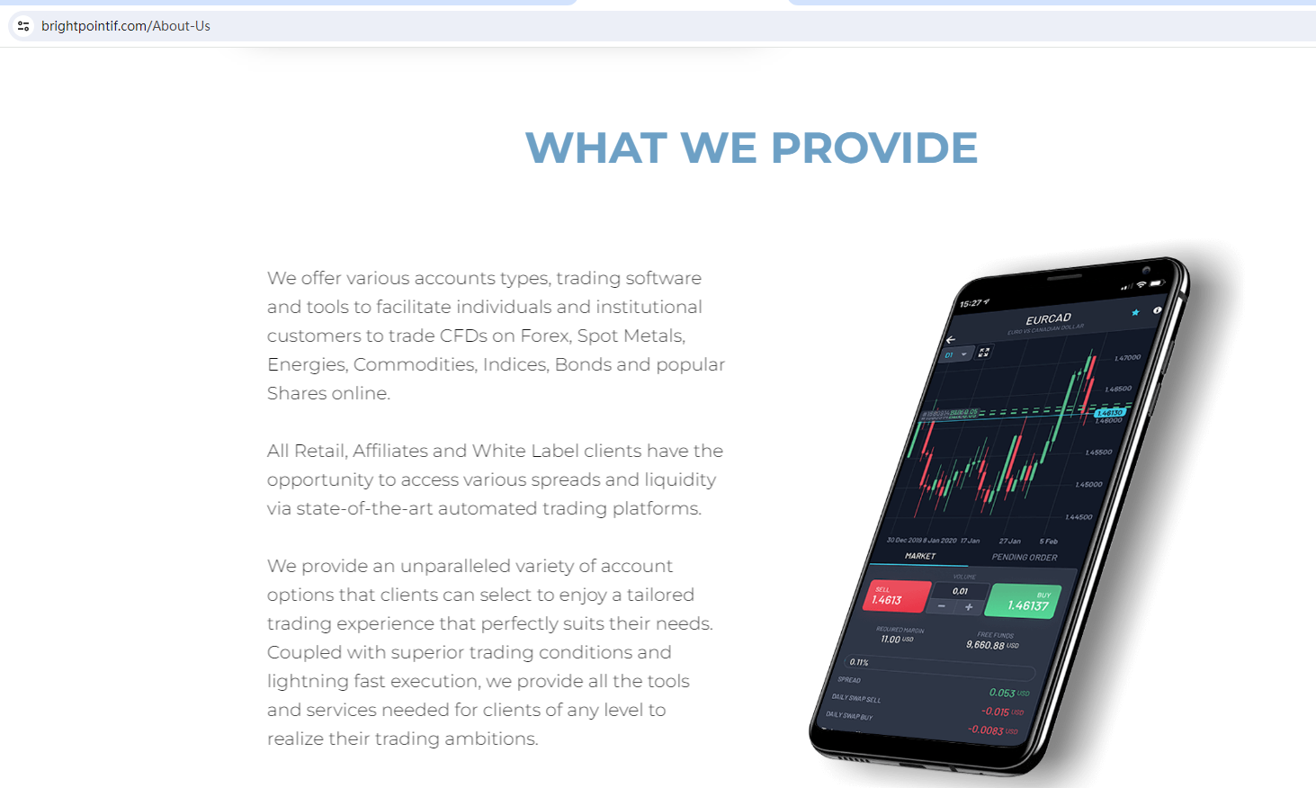 BrightPointif claims to be a reliable company without presenting any information about its regulation or contact. The lack of such important information may be a distinct signal of an unlicensed broker, as regulated companies always present their accreditations and licenses in a prominent position.
