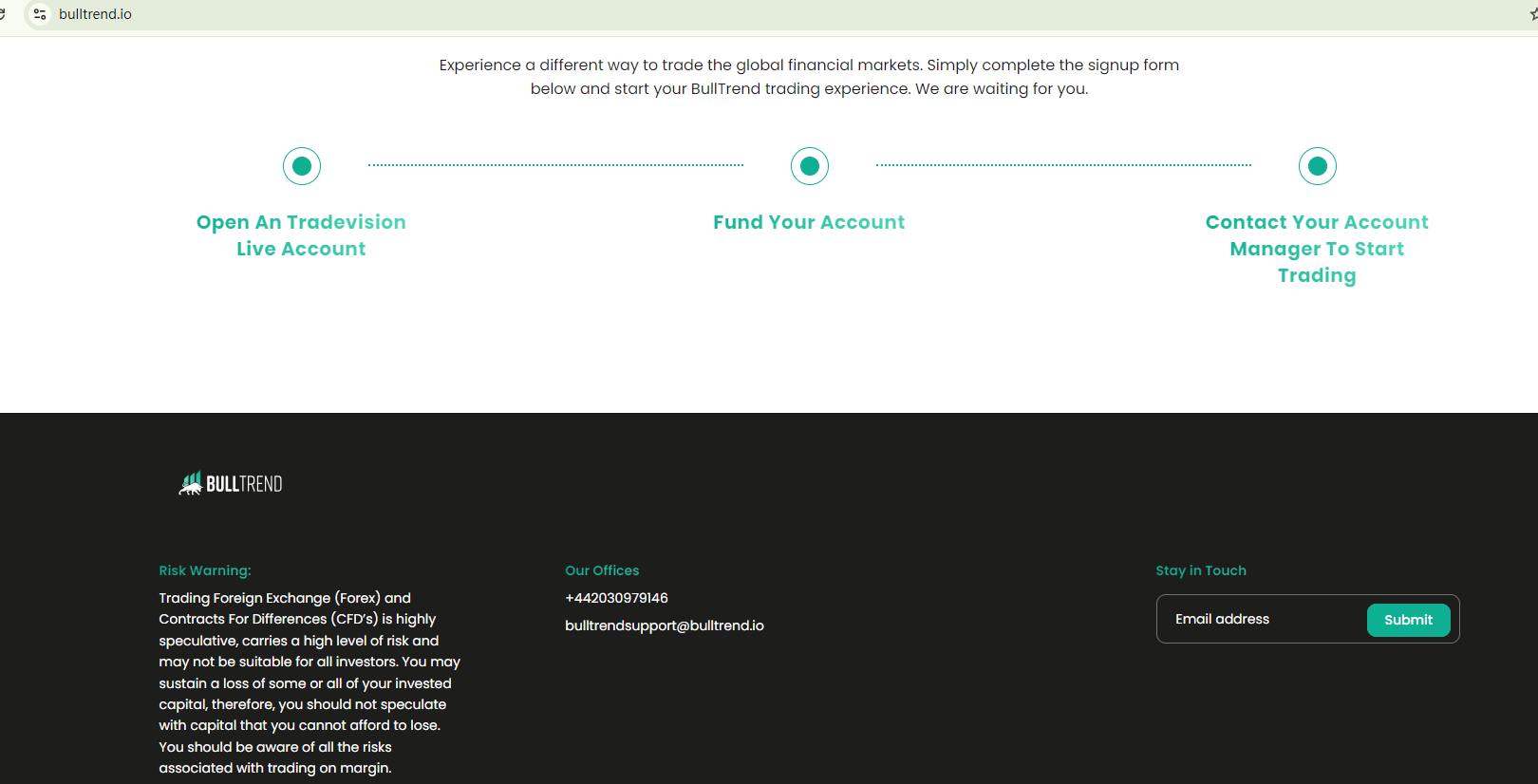 BullTrend's website mirrors those of previously flagged fraudulent brokers. It fails to provide any licensing details to verify its legitimacy, which is a significant red flag for potential fraudulent activities.Additionally, the Financial Conduct Authority (FCA) has issued a warning about BullTrend, advising investors to avoid this unauthorized firm due to suspicions of involvement in fraudulent schemes.In essence, BullTrend is not regulated by any governing body. Entrusting it with investors' funds is highly risky, as there are no legal protections in place to safeguard the funds.BullTrend appears to be a scam.