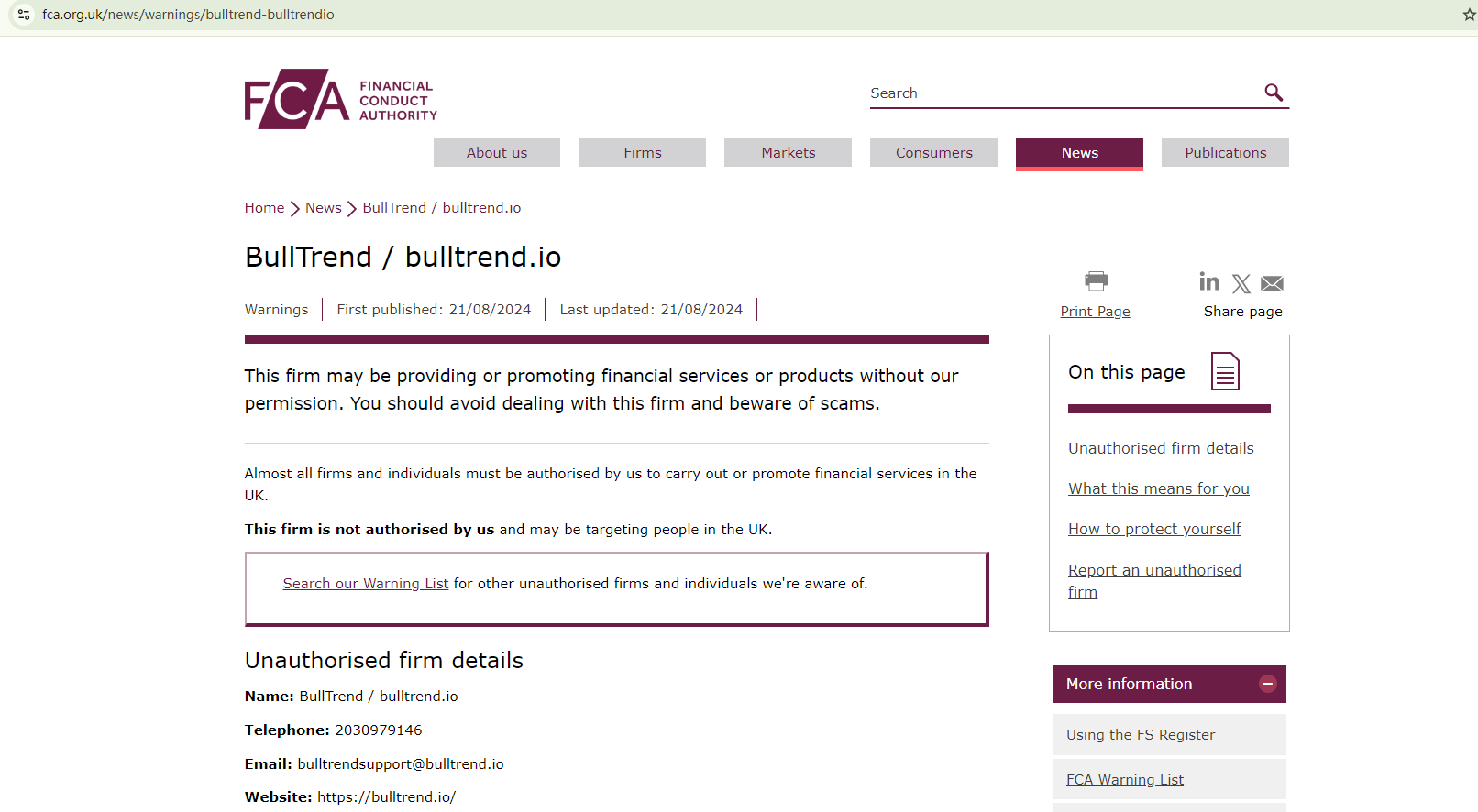 Additionally, the Financial Conduct Authority (FCA) has issued a warning about BullTrend, advising investors to avoid this unauthorized firm due to suspicions of involvement in fraudulent schemes.
