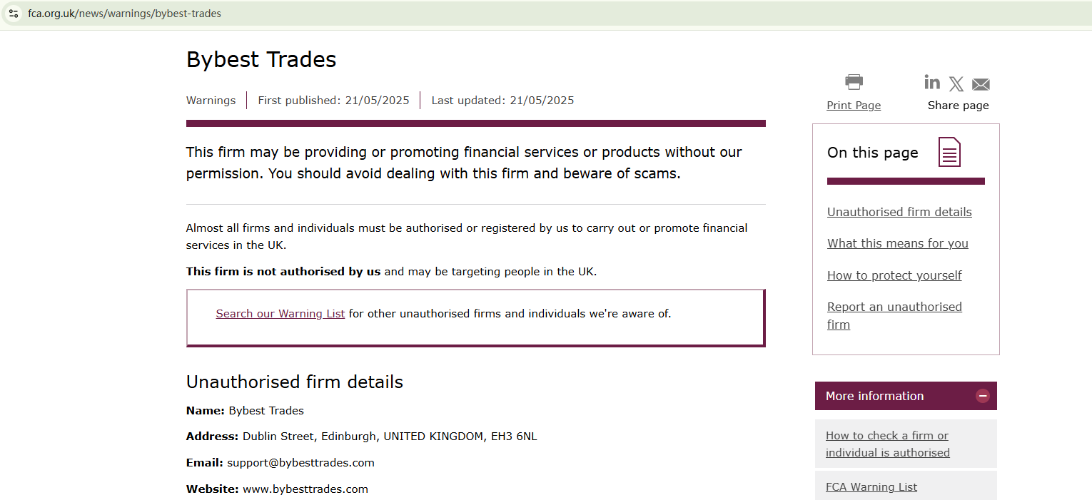 The Financial Conduct Authority (FCA) has issued a warning against Bybest Trades, citing its operation without the required authorization.