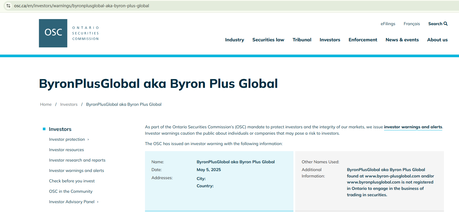ByronPlusGlobal operates through two links, with one disabled currently. The trading platform, despte claiming to be a CFDs broker, hasn't disclosed any useful information about its legal structures and regulatory status. This lack of transparency raises a red flag. What's more, the Ontario Securities Commission (OSC) has issued a warning against ByronPlusGlobal, stating that this broker is not registered in Ontario to engage in the business of trading in securities.