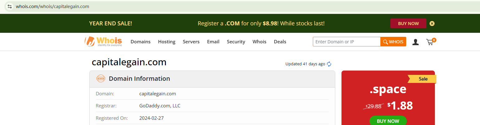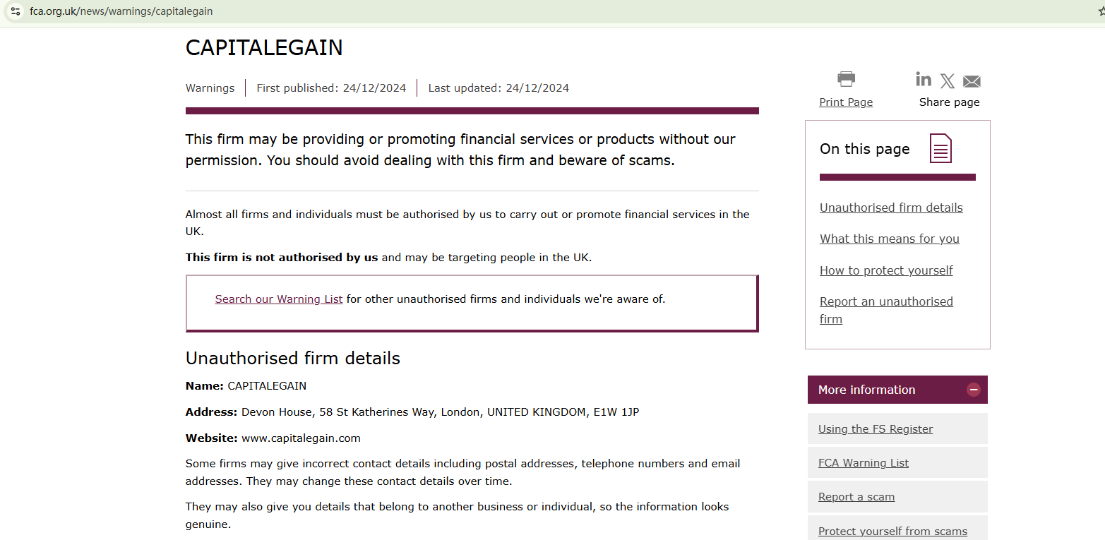 The use of a website template commonly associated with fraudulent investment activities raises the alarm: the content and graphic designs are almost provided by the template, probably not reflecting what CAPITALEGAIN truely offers. Our investigation found that the domain name was just registered at the end of February 2024, rendering the trading platform relatively new. The broker claims to be based in the UK, but the British financial regulator, Financial Conduct Authority (FCA) has issued a warning against CAPITALEGAIN for the lack of the required authorization.