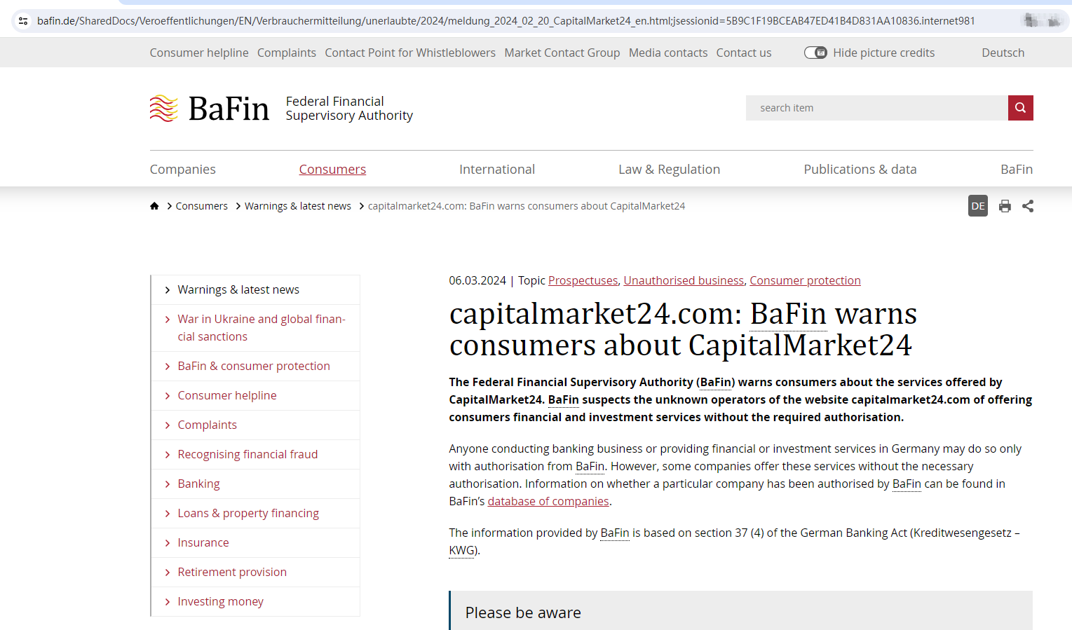 Unknown operators provide financial services through the website capitalmarket24.com without the required authorization. There are no indications that it is registered with any pertinent financial regulator.