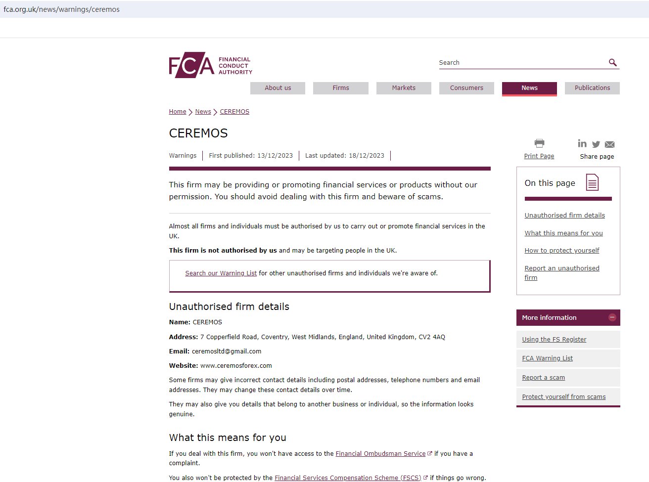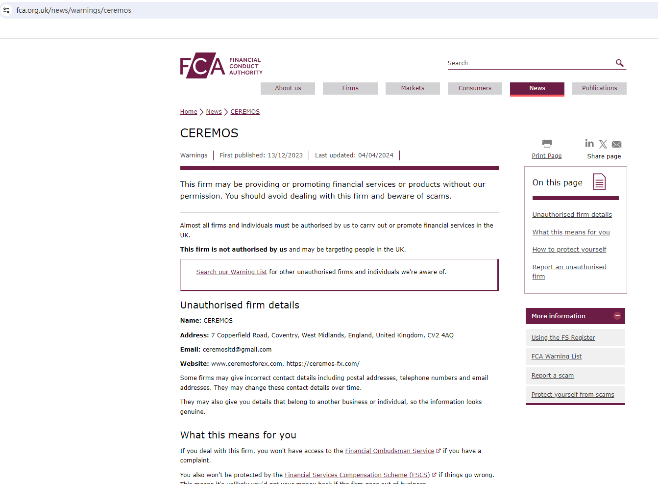 • Dec 18, 2023 The UK FCA issued a Warning against CEREMOS