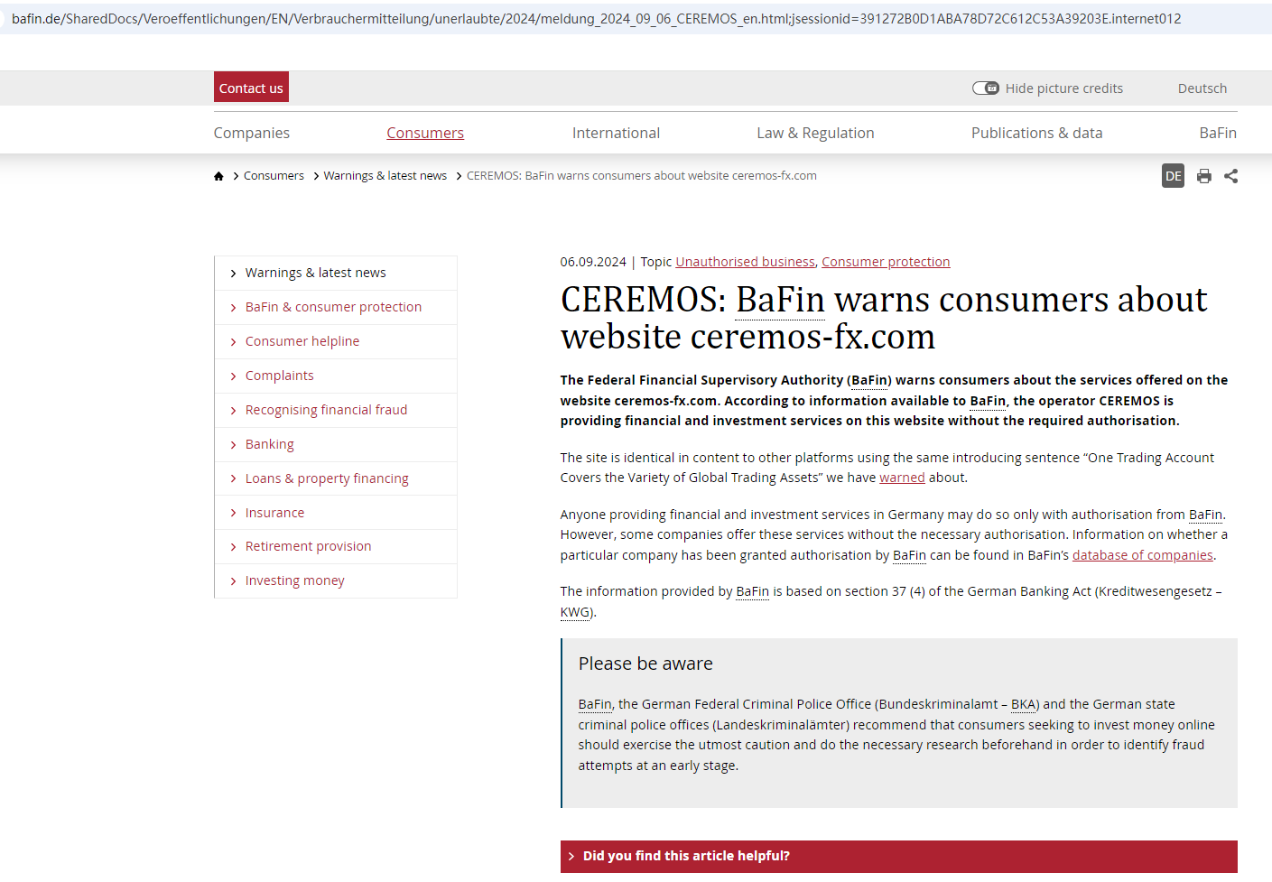 On 6 September 2024, The Federal Financial Supervisory Authority (BaFin) issued a warning against CEREMOS (ceremos-fx.com), believing this company is providing financial and investment services on this website without the required authorisation. You may visit: https://www.bafin.de/SharedDocs/Veroeffentlichungen/EN/Verbrauchermitteilung/unerlaubte/2024/meldung_2024_09_06_CEREMOS_en.html;jsessionid=391272B0D1ABA78D72C612C53A39203E.internet012
