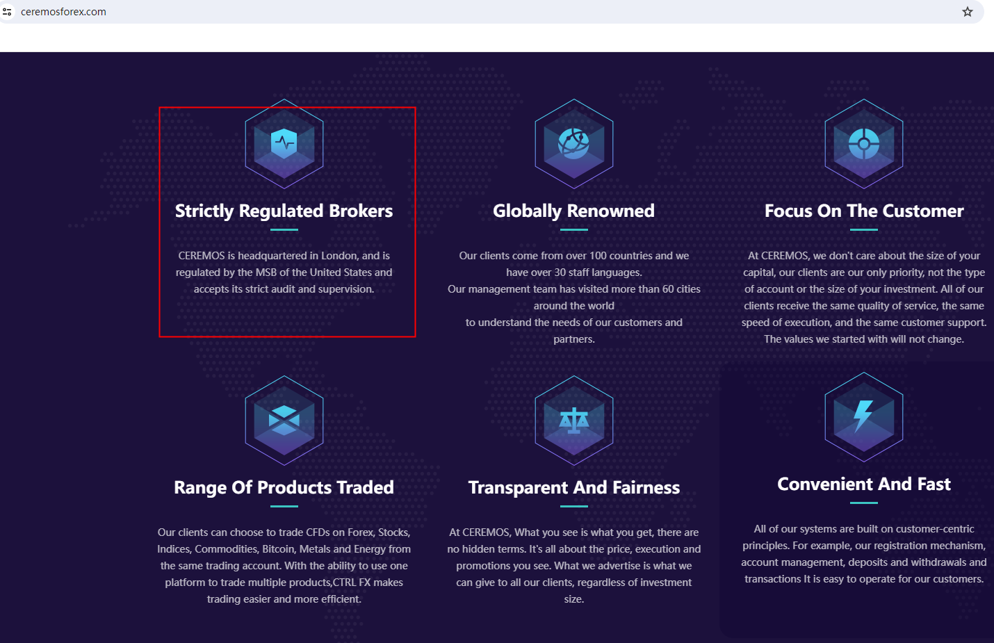 According to its website, it is located in the London, and is regulated by US Financial Crimes Enforcement Network (FinCEN). Upon investigation, we searched the FinCEN and found a matching result. However, FinCEN is not the regulator in charge of forex and CFD brokers. Furthermore, we searched the National Futures Association (NFA), and no matching information was found in the NFA.In addition, the United Kingdom Financial Conduct Authority (UK FCA) issued a warning that CEREMOS was providing financial services or products in the UK without authorisation. The truth is that CEREMOS is not under valid regulation by any regulators to do forex. Investors' funds in this broker are unsafe and cannot be protected by any law.CEREMOS is a scam.