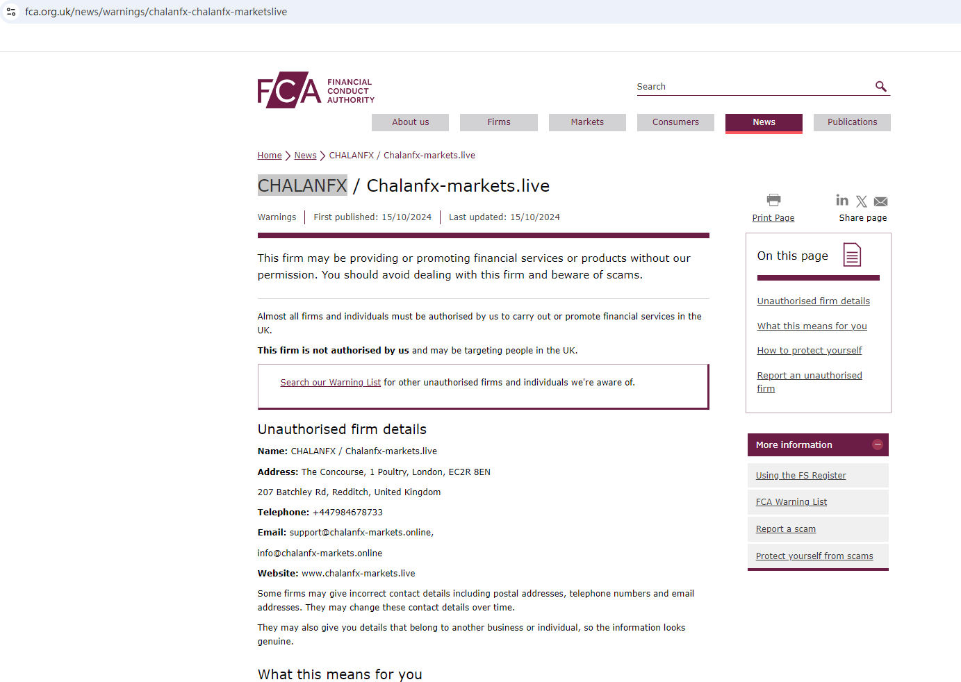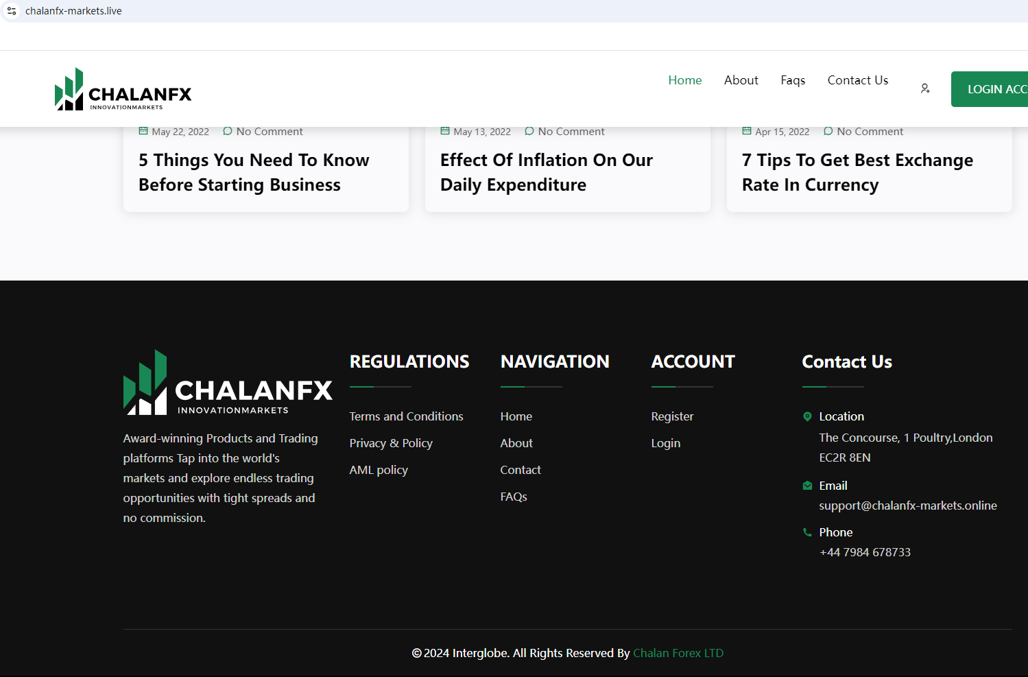 According to its website, it is located in the UK. Upon investigation, we found that the Financial Conduct Authority (FCA) warned against CHALANFX, believing this company might be providing financial services or products without proper authorization in the UK.