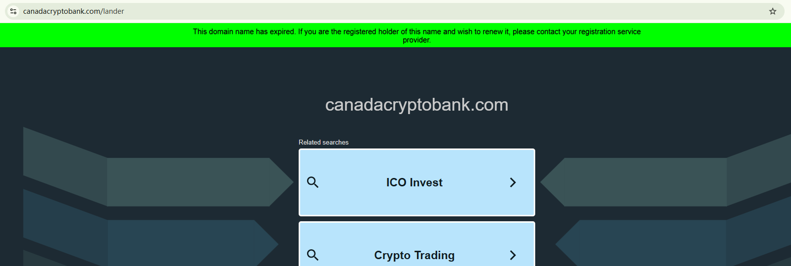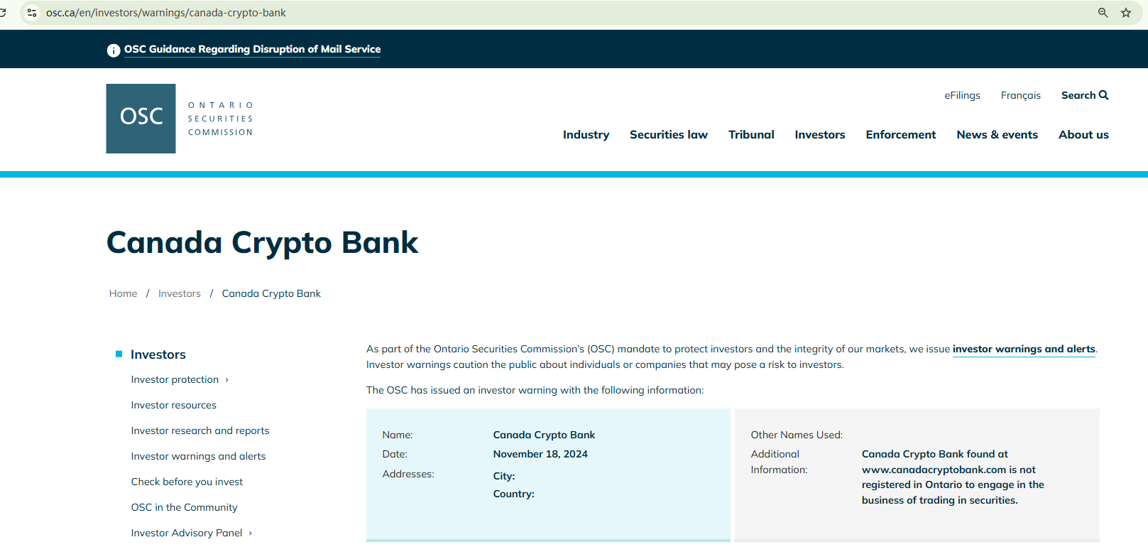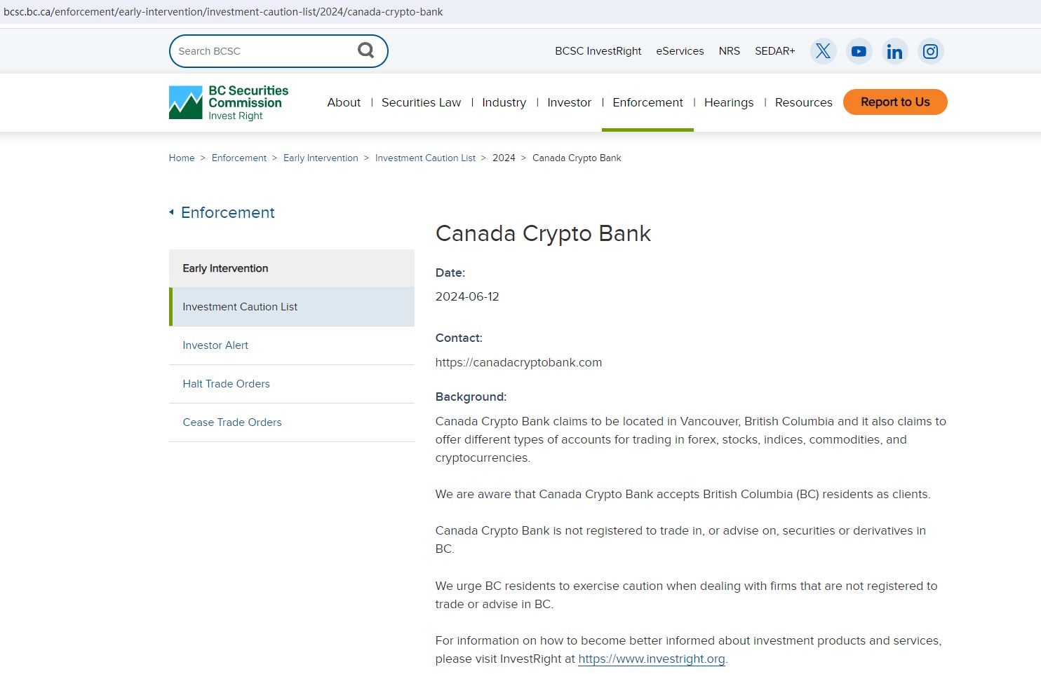 The British Columbia Securities Commission (BCSC) issued a warning against Canada Crypto Bank (https://canadacryptobank.com), believing this company is providing financial and investment services on this website without the required authorisation in Canada.