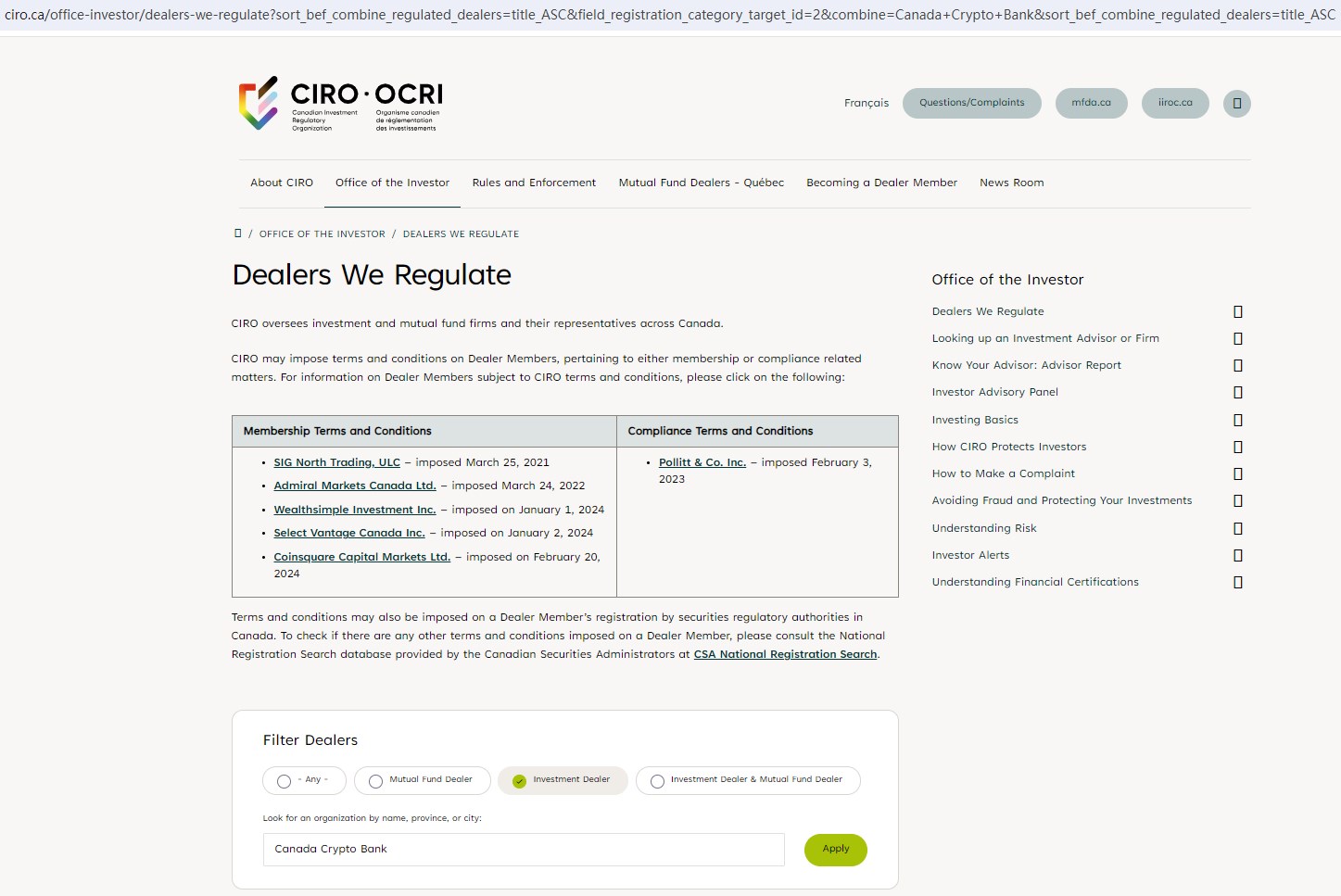 Upon investigation, we found that Canada Crypto Bank is not regulated by the Investment Industry Regulatory Organization of Canada (IIROC).