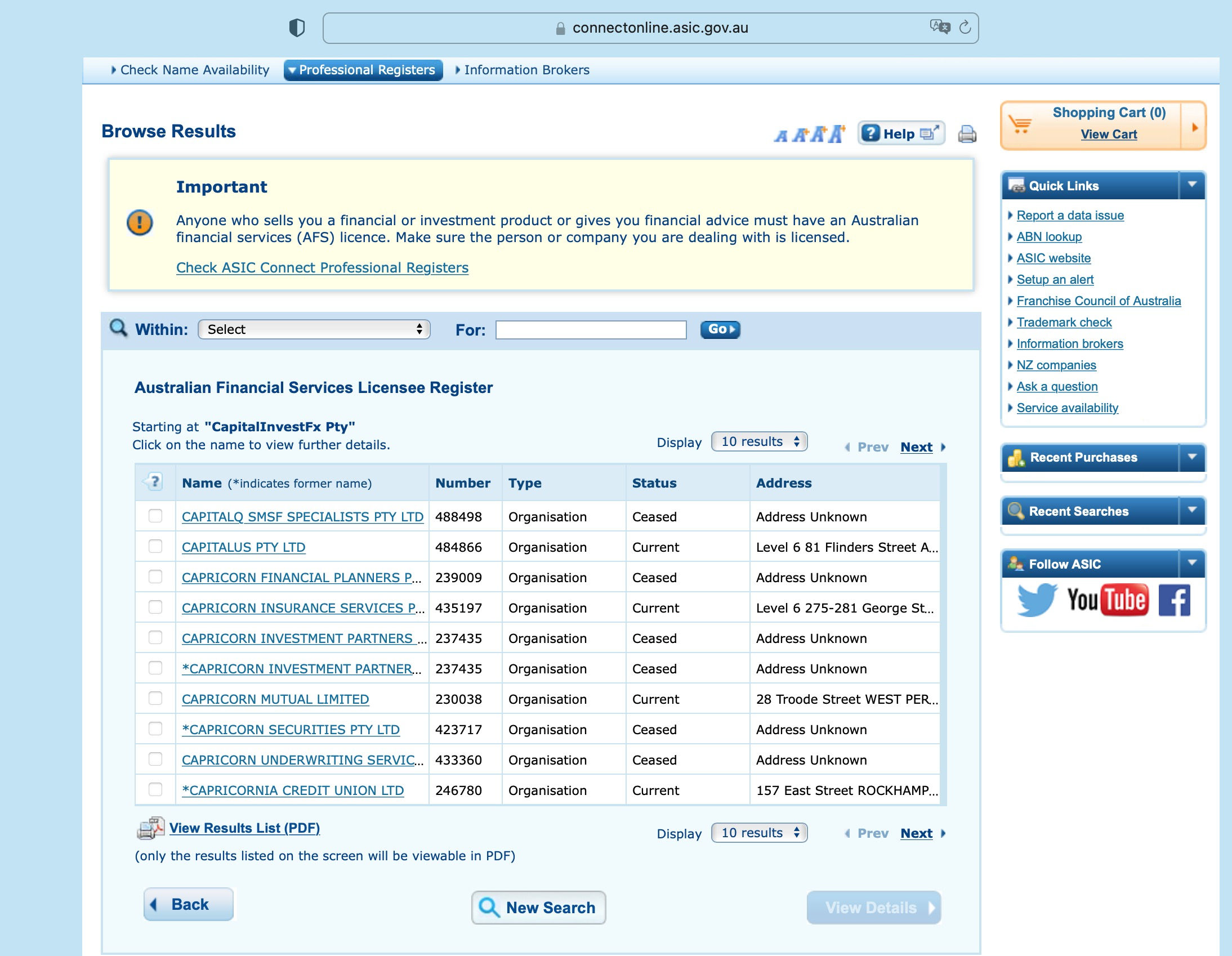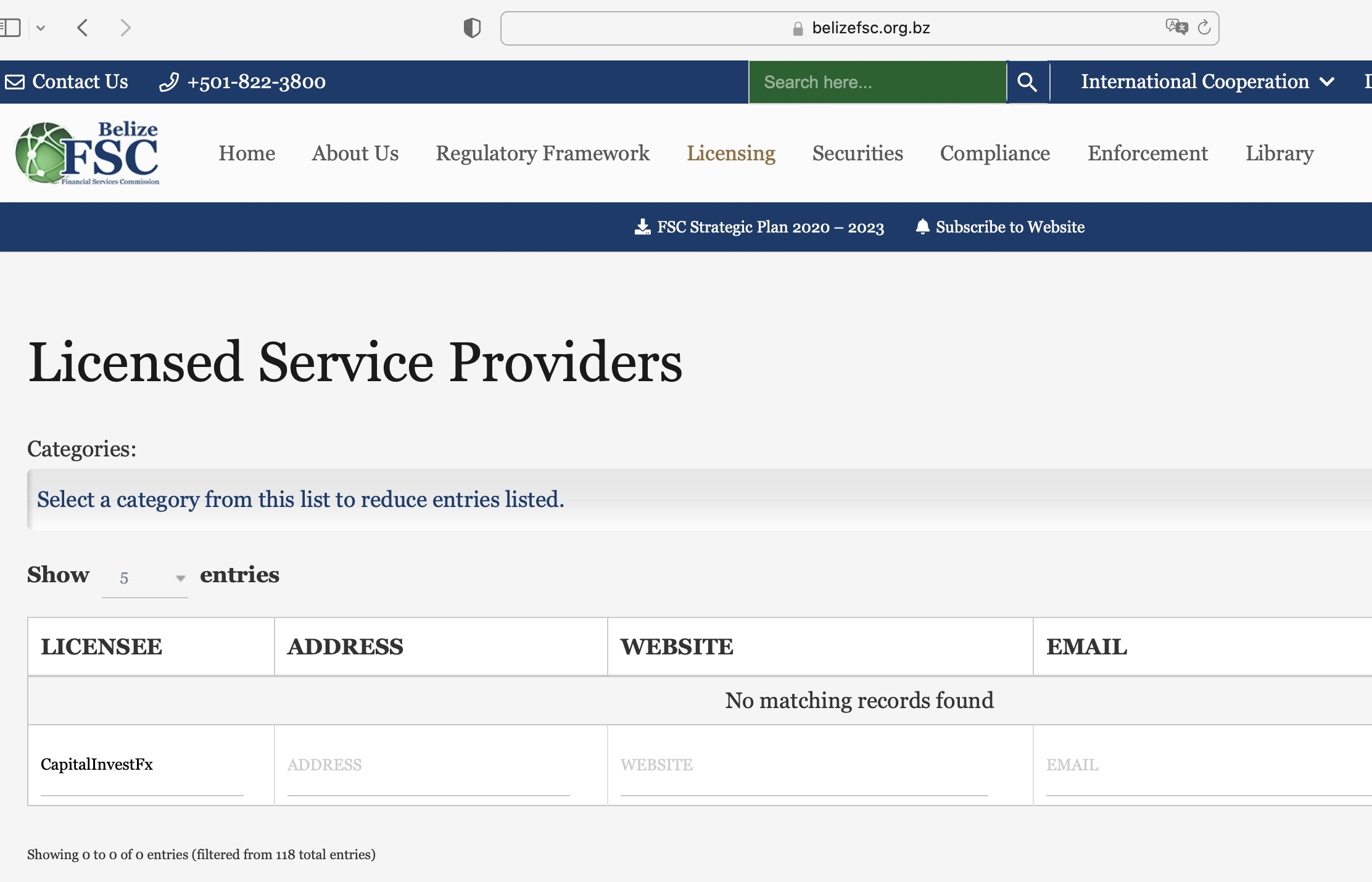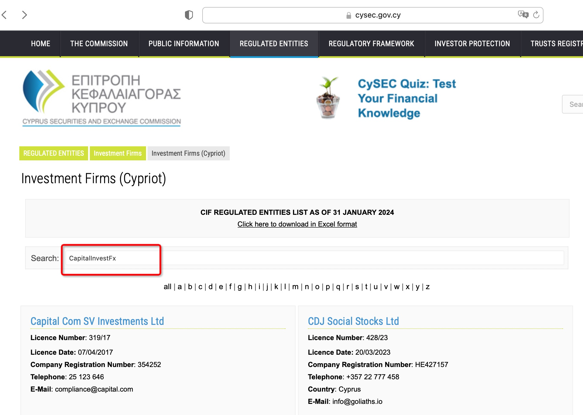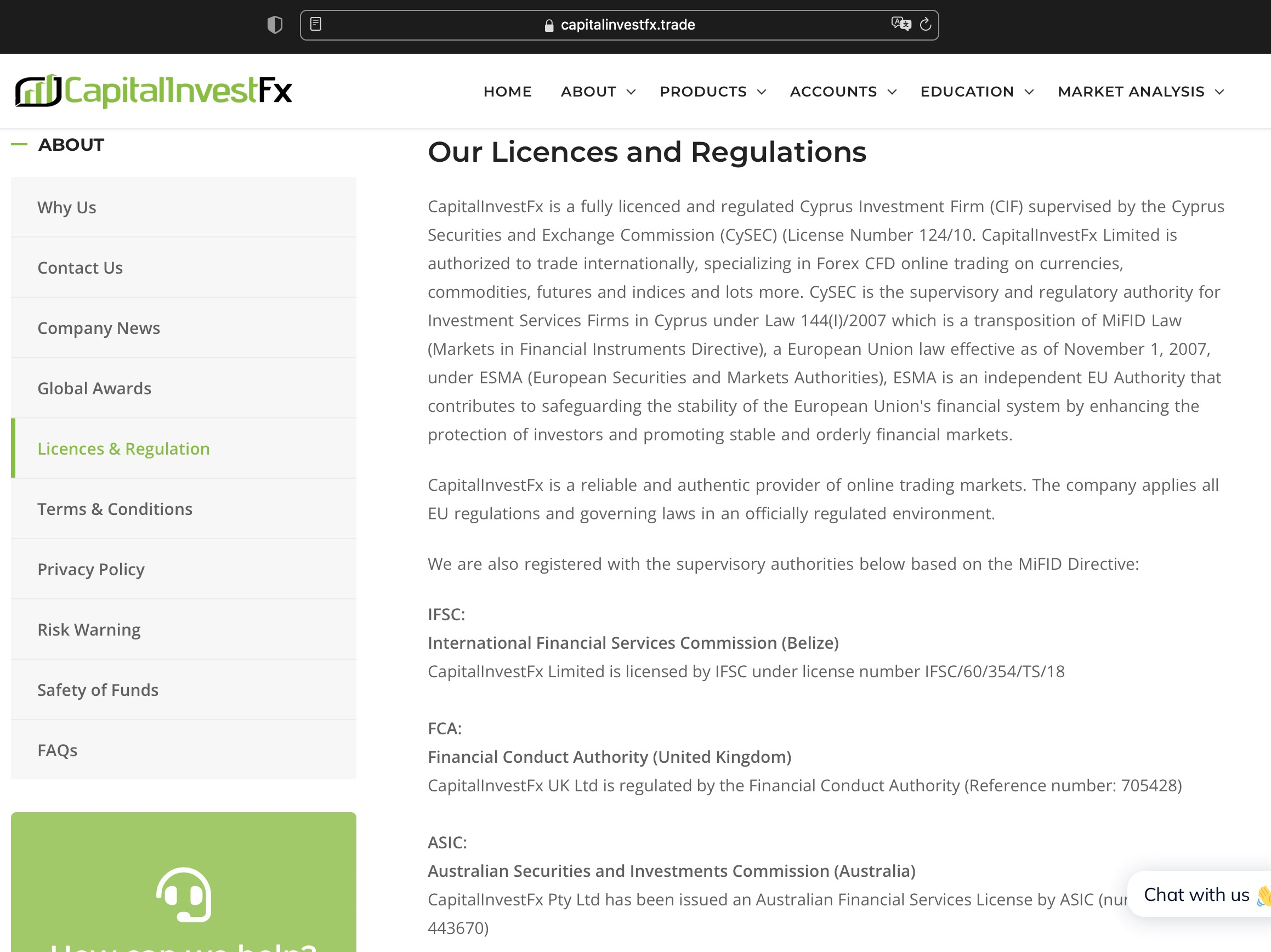 CapitalInvestFx claims to be regulated by the Cyprus Securities and Exchange Commission (CySEC) (License Number 124/10), the Belize Financial Services Commission (Belize FSC) under license number IFSC/60/354/TS/18, the UK Financial Conduct Authority (FCA) (Reference number: 705428) and the Australian Securities and Investments Commission (ASIC) (number: 443670).