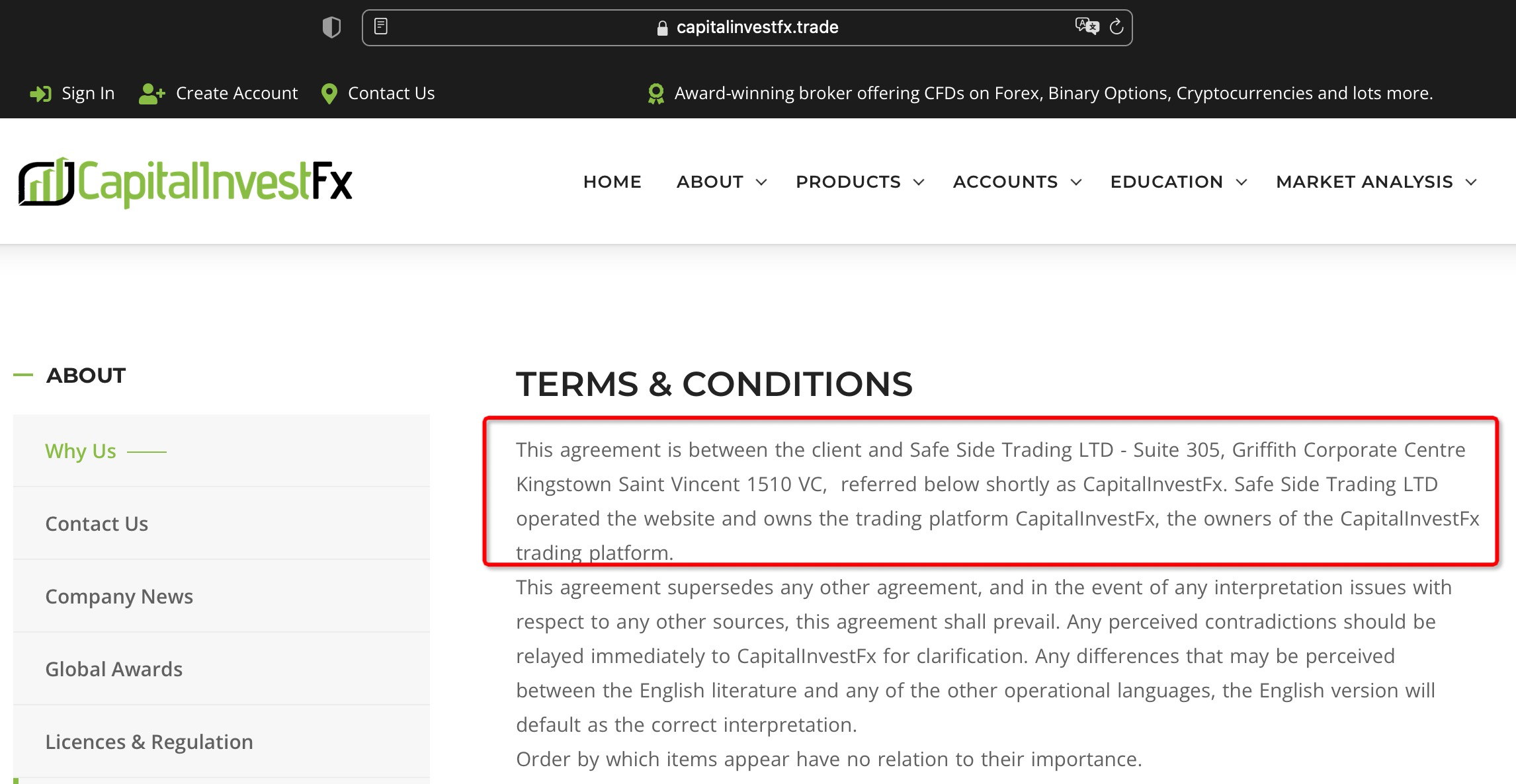 CapitalInvestFx claims to be operated by Safe Side Trading LTD, which is registered in Saint Vincent and the Grenadines.