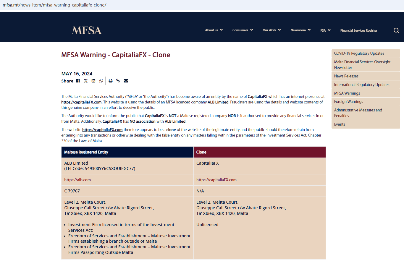 Upon investigation, the company name corresponding to Malta MFSA 79767 is ALB LIMITED, and the registration website is www.alb.com, www.kimuratrading.com/it/home. Our investigation also found that the design of the web page www.alb.com and capitaliafx.com are similar. Obviously CapitaliaFX pretended to be regulated by MFSA.