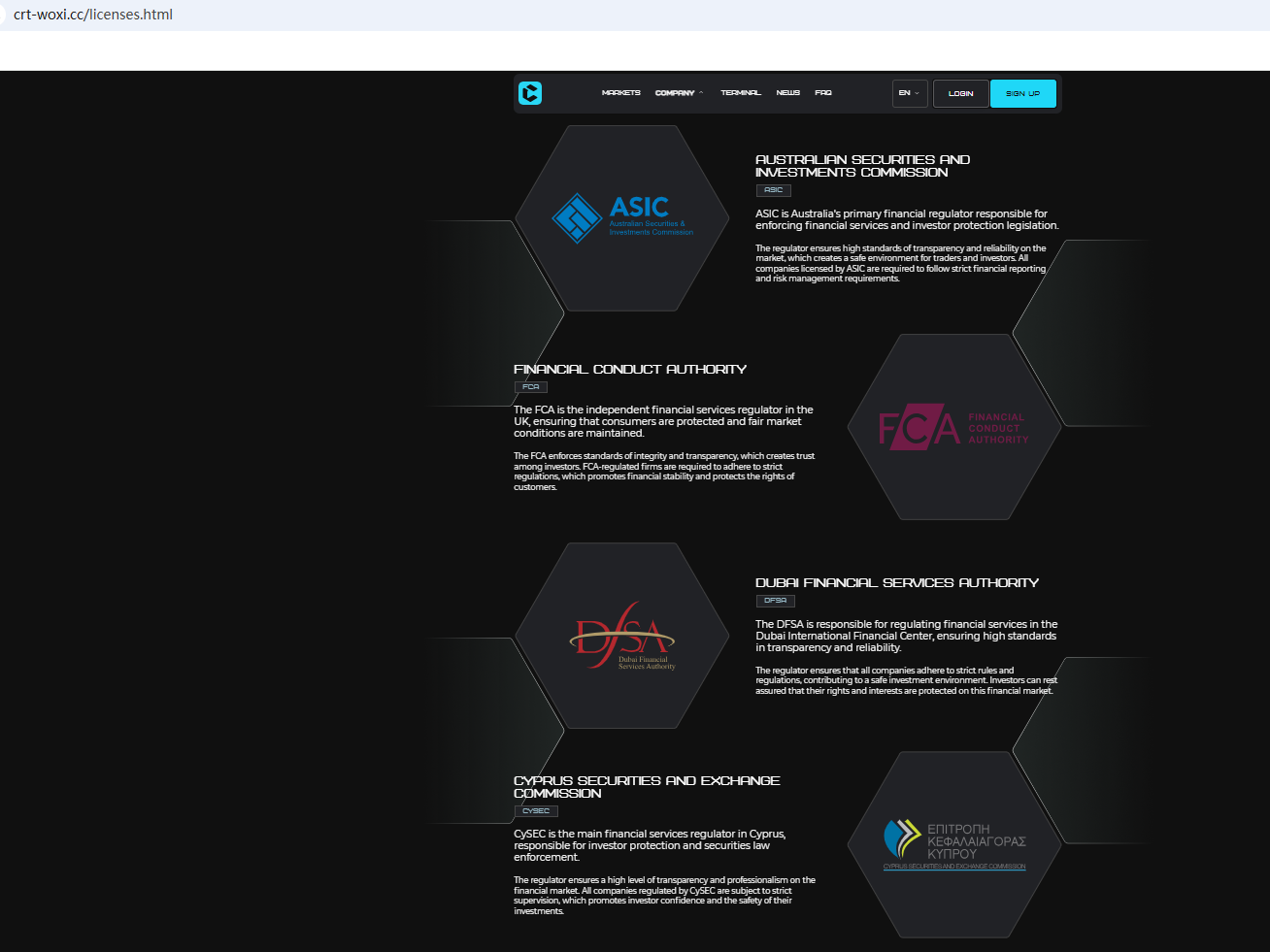 According to its website, it claims to be registered with multiple regulatory bodies. Upon investigation, no matching information was found in the Australia Securities & Investment Association (ASIC), Financial Conduct Authority (FCA), and Dubai Financial Services Authority (DFSA).