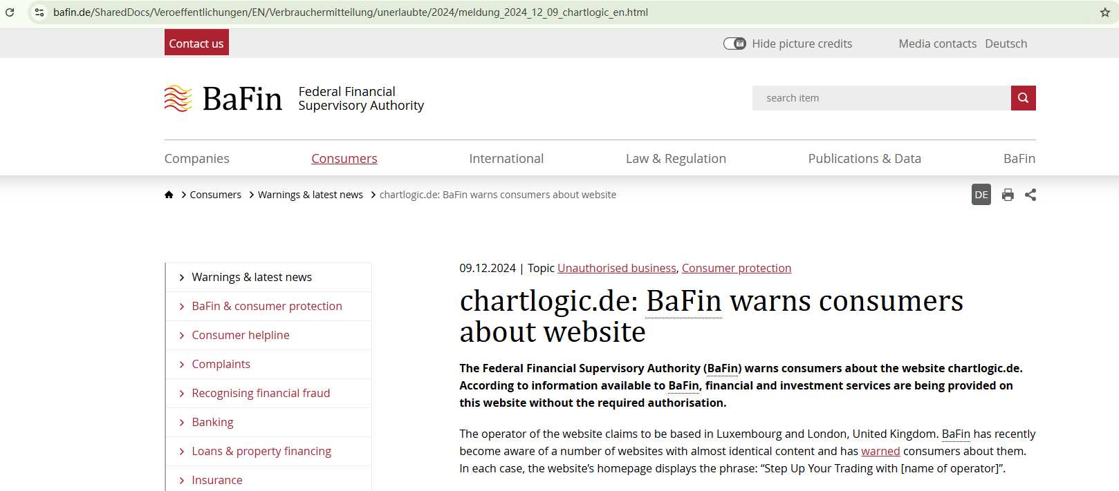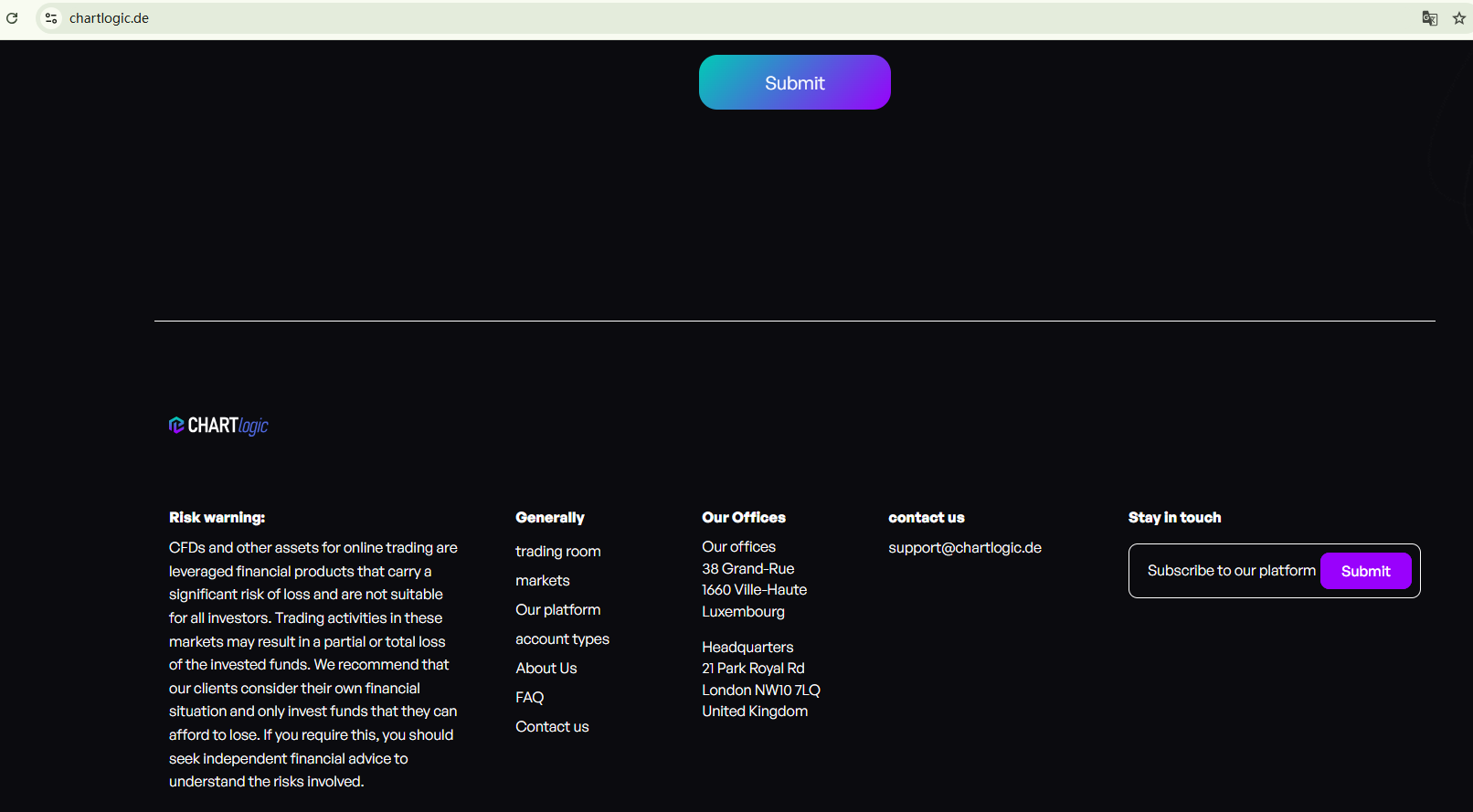 The use of a website template commonly associated with fraudulent activities is a red flag. The content on the site is almost provided by the template. Whether ChartLogic provides those services or products is unclear. We haven't found valid information about the company, and the Federal Financial Supervisory Authority (BaFin) has issued a warning against ChartLogic for the lack of the required authorization.