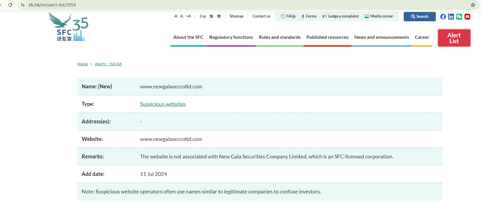 The website newgalaseccoltd.com falsely claims to be operated by New Gala Securities Company Limited under the license issued from the Hong Kong Securities and Futures Commission (HK SFC). To refute that claim and raise public awareness, the HK SFC issued a warning about newgalaseccoltd.com. According to the HK SFC, newgalaseccoltd.com has nothing to do with the licensed entity, New Gala Securities Company Limited. This is a case of identity theft.