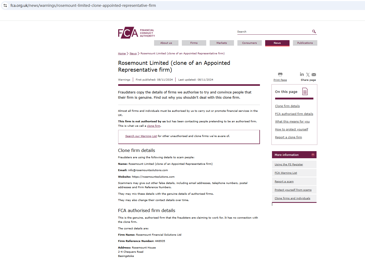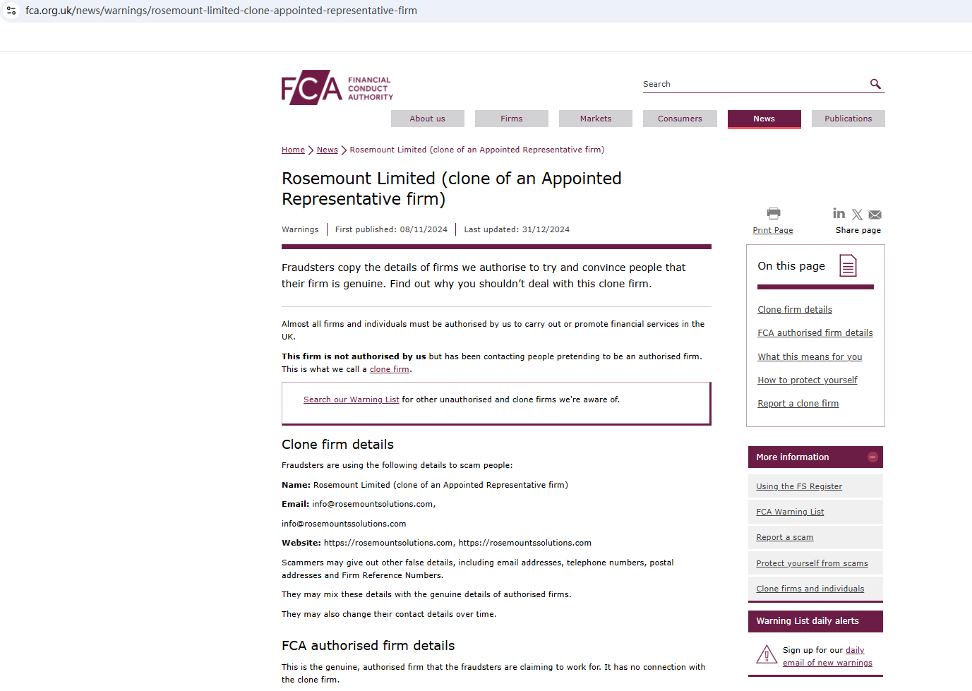According to its website, it claims to be a reliable broker, but does not display any valid information on the website for inquiry. In addition, the Financial Conduct Authority (FCA) issued a warning against rosemountsolutions.com, identifying this company as a clone of an FCA-authorized firm.In conclusion, rosemountsolutions.com is definitively a scam. Investors are strongly advised to steer clear of it.