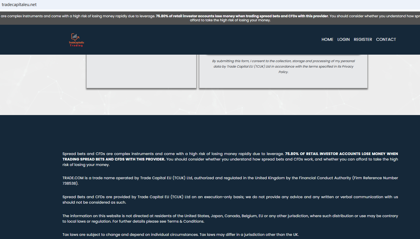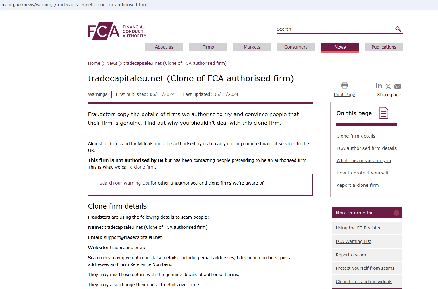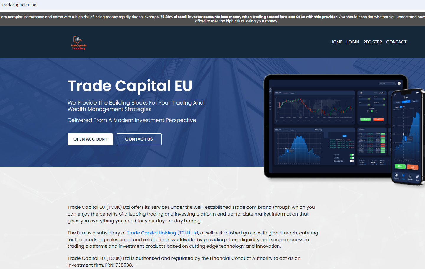 Tradecapitaleu.net is flagged by the Financial Conduct Authority (FCA) as a clone firm. According to the FCA, tradecapitaleu.net misuses information including the company name of an FCA-authorized firm, Trade Capital UK (TCUK) Ltd, to appear legitimate and authentic. In fact, tradecapitaleu.net has no affiliation with the genuine company. This is a case of identity theft.