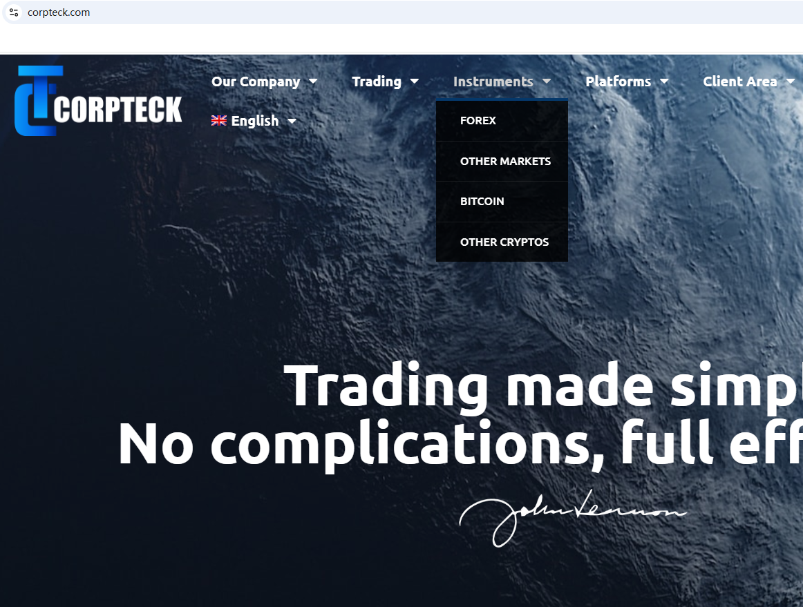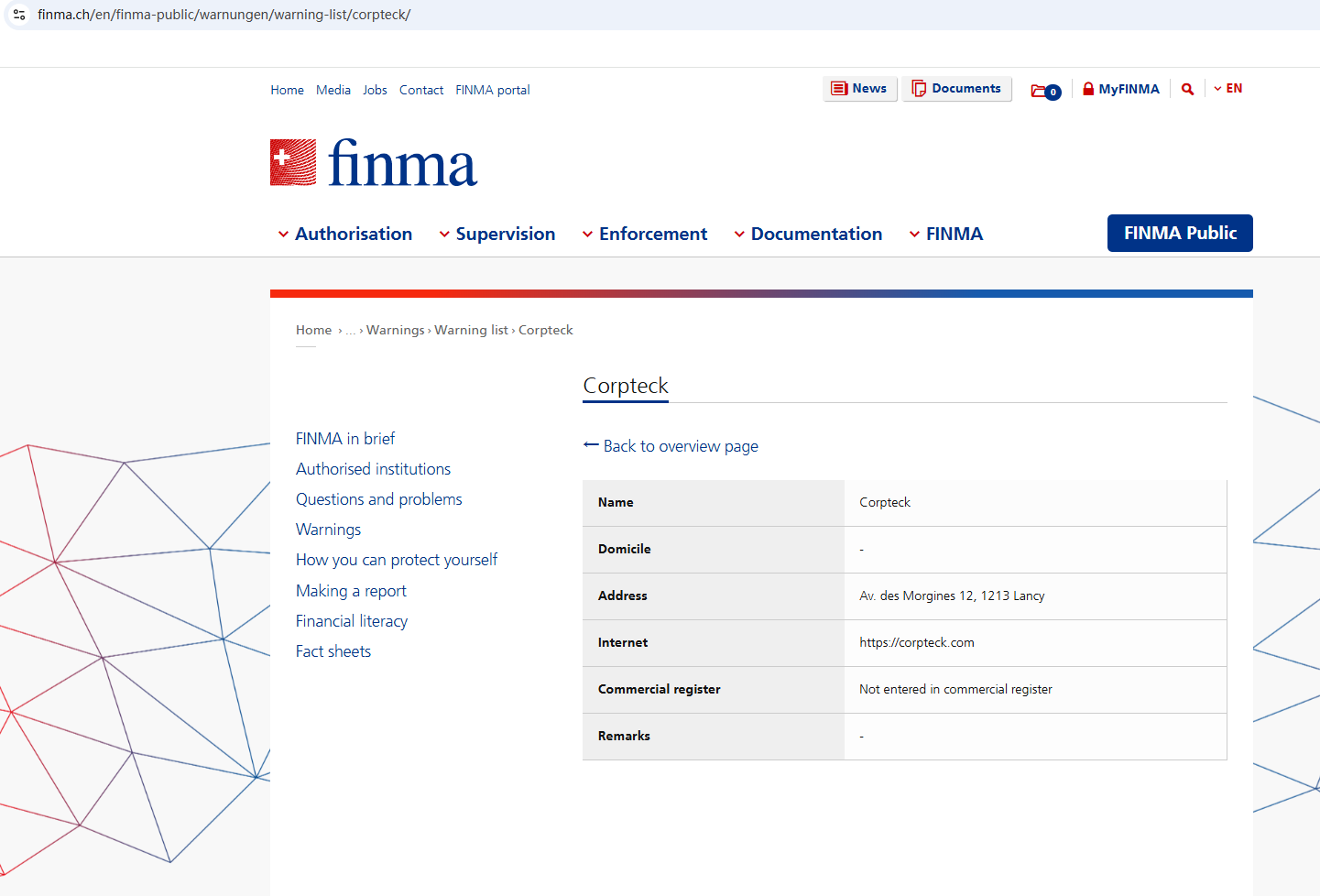 According to its website, it is located in the Switzerland. Upon investigation, we found that the Swiss Financial Market Supervisory Authority (FINMA) issued a warning against Corpteck, stating that this broker is not entered in its commercial register.In essence, Corpteck is not regulated by any governing body. Entrusting it with investors' funds is highly risky, as there are no legal protections in place to safeguard the funds.Corpteck appears to be a scam.