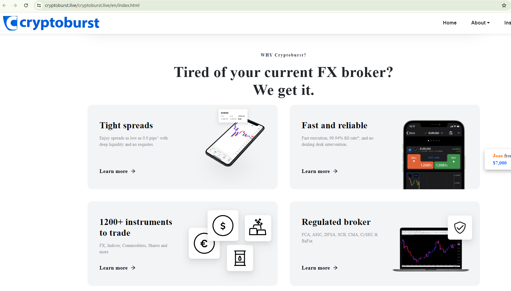 Cryptoburst, which claims to be registered with the Securities Commission of the Bahamas (SCB), has been added to the SCB's warning list, refuting such a claim. This is a significant indicator of a scam.Although Cryptoburst, a forex broker, purports to be domiciled in the US, there are no indications that it is registered with the National Futures Association (NFA). This suggests that Cryptoburst is operating in the US without authorization.Furthermore, the link labeled "Why Cryptoburst" leads to a "404 Not Found" page, indicating issues with the company's resources and reliability.In essence, Cryptoburst is not regulated by any governing body. Entrusting it with investors' funds is highly risky, as there are no legal protections in place to safeguard the funds.Cryptoburst appears to be a scam.