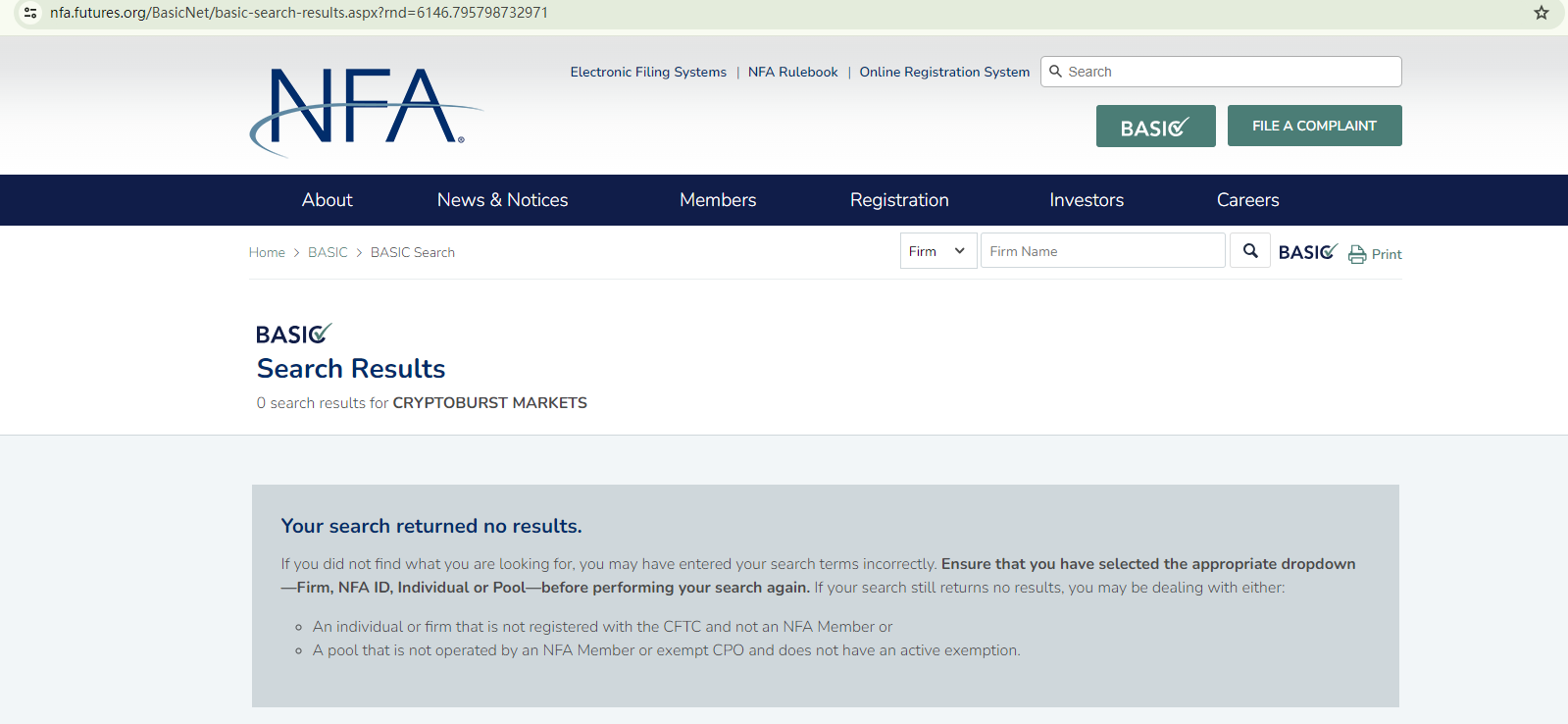 Although Cryptoburst, a forex broker, purports to be domiciled in the US, there are no indications that it is registered with the National Futures Association (NFA). This suggests that Cryptoburst is operating in the US without authorization.
