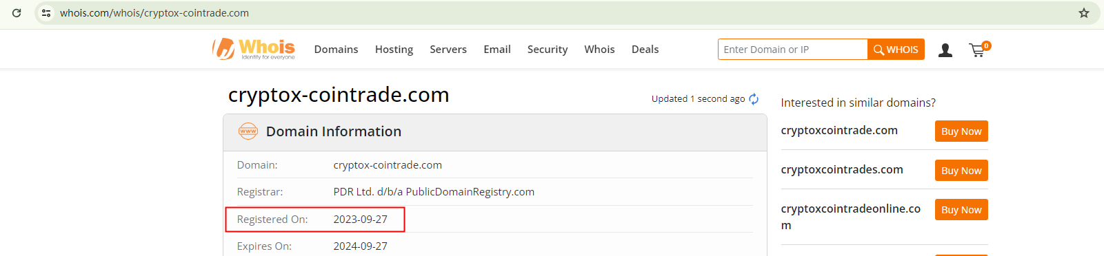 Secondly, it attempts to establish credibility through the use of exaggerated language and unverified awards. However, the domain name cryptox-cointrade.com was only registered in September 2023. It is highly unlikely for a broker to achieve significant reputation and accolades within such a short timeframe.