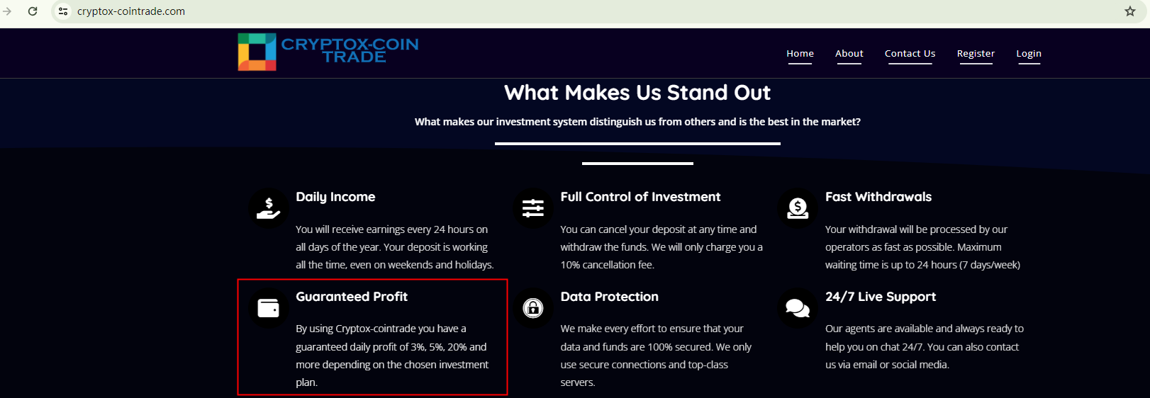 Cryptox Cointrade displays several characteristics that are commonly associated with fraudulent operations.Firstly, it lacks crucial regulatory information. Despite claiming to be based in the US, it is not a member of the National Futures Association (NFA), which is a requirement for regulated operations in the country.Secondly, it attempts to establish credibility through the use of exaggerated language and unverified awards. However, the domain name cryptox-cointrade.com was only registered in September 2023. It is highly unlikely for a broker to achieve significant reputation and accolades within such a short timeframe.Lastly, it promises extraordinarily high daily profits, which is unrealistic. While a forex broker can provide the platform and tools for trading, they cannot guarantee passive profits. Success in forex trading largely depends on the trader's knowledge, strategy, and risk management skills. Therefore, the promised return on investment (ROI) appears to be a lure to attract unsuspecting investors.In essence, Cryptox cointrade is not regulated by any governing body. Entrusting it with investors' funds is highly risky, as there are no legal protections in place to safeguard the funds.Cryptox cointrade appears to be a scam.