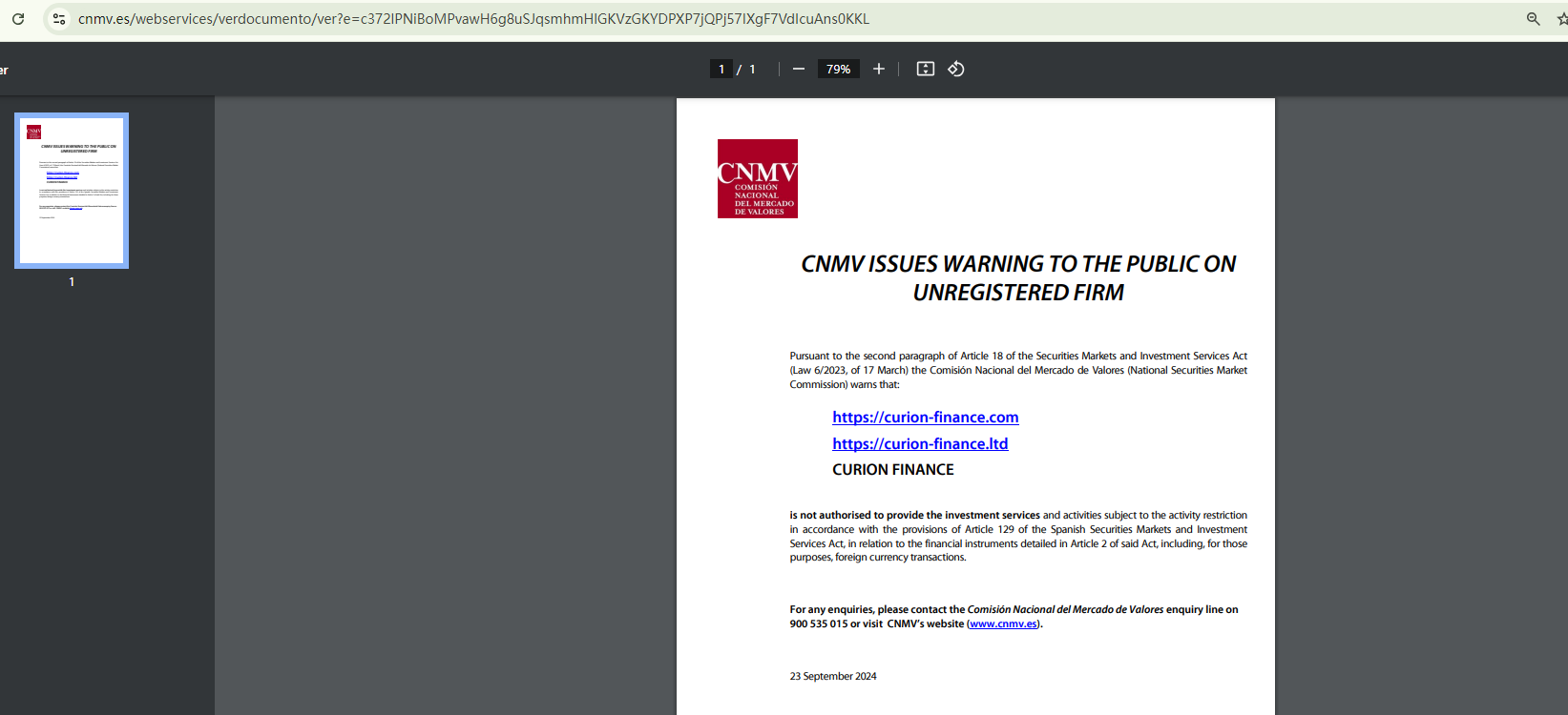 Despite claiming to have been established in 2010, the website is less than 5 months old. Additionally, the Comisión Nacional del Mercado de Valores (CNMV) has added Curion Finance to its warning list for providing investment services without authorization.