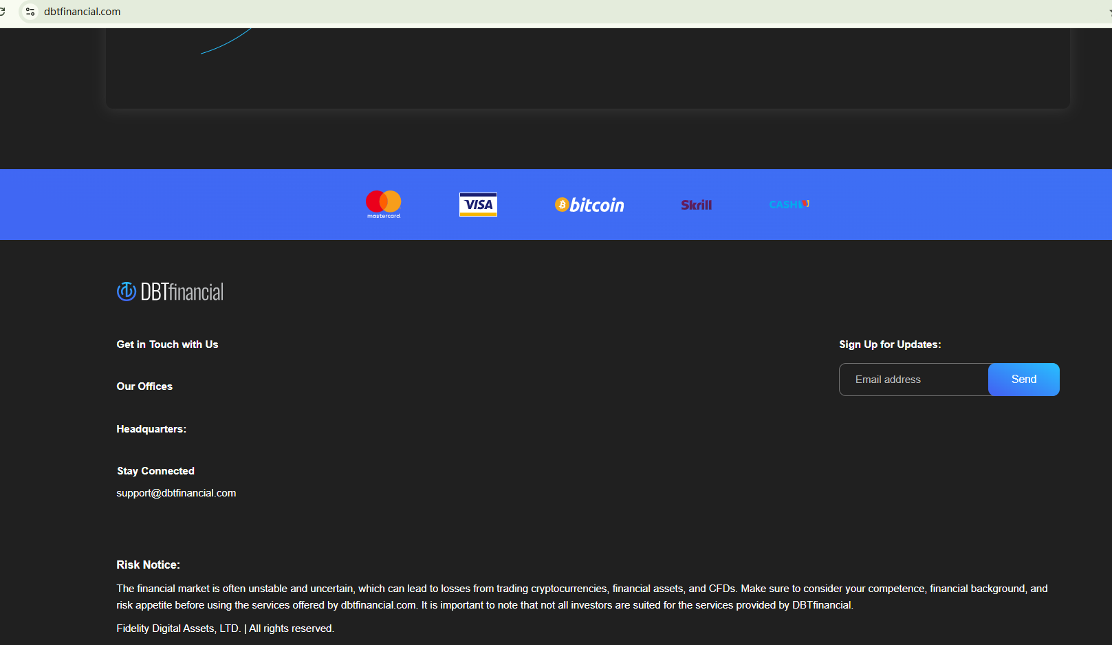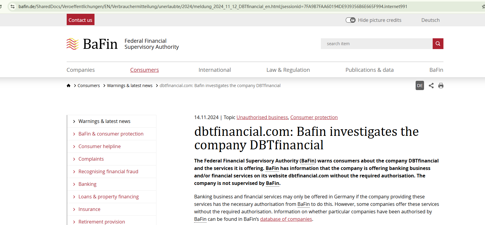 DBTfinancial claims to have a large scale of business in the financial industry. However, this company's domain name was recently registered in June 2024. This inconsistency is a red flag. The website doesn't disclose any useful company information to ensure transparency, nor do they provide valid licensing details to demonstrate their legitimacy. In addition, the Federal Financial Supervisory Authority (BaFin) has issued a warning against DBTfinancial for unauthorized offerings. They underscore that it is not supervised by them.