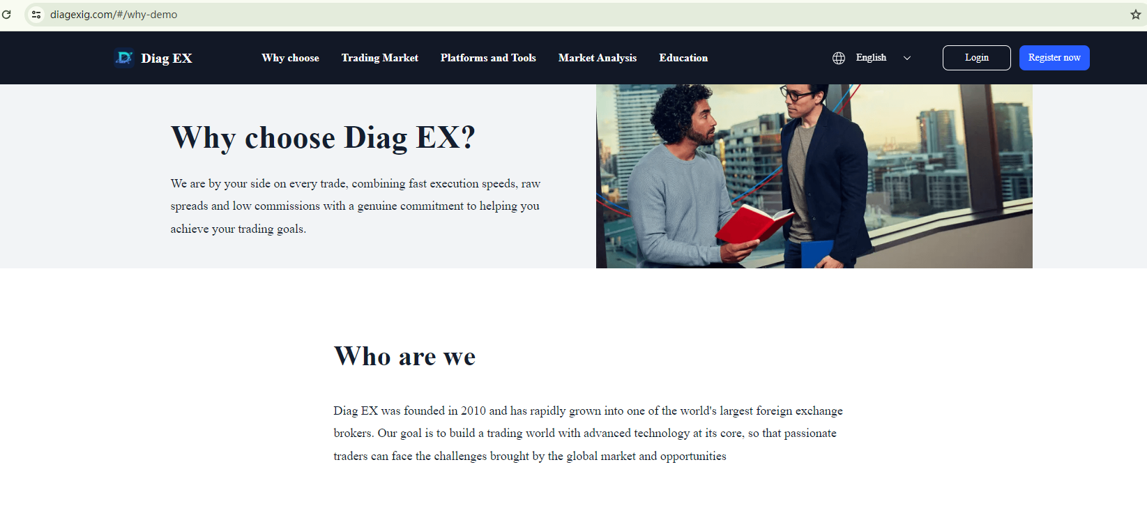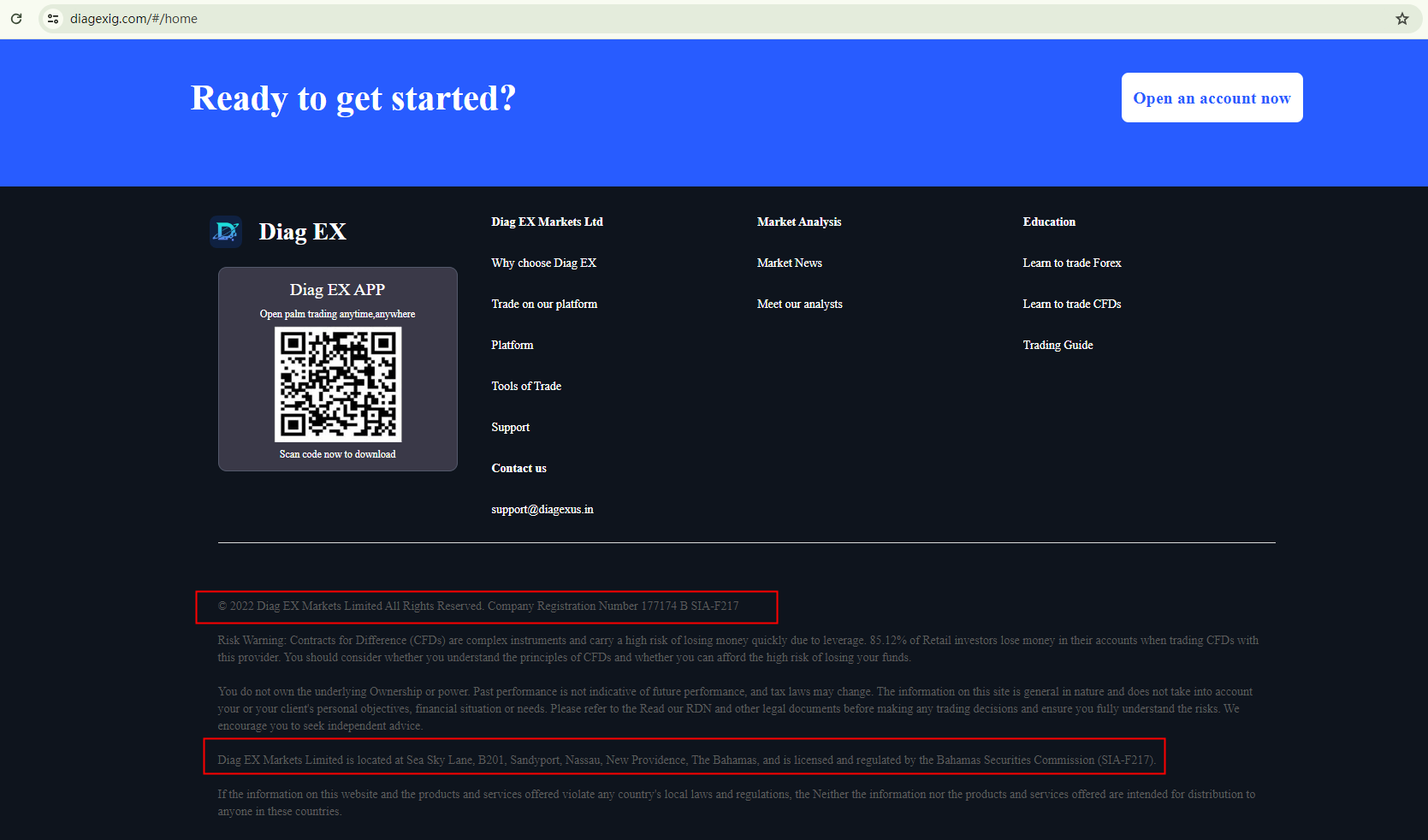 Diag EX's website bears a striking resemblance in content to that of DEMO, a scam broker previously flagged by BrokersView. This is particularly evident in the alleged physical address, registration information, brand's age, and the purported awards. This is a significant indicator of a scam.Similarly, Diag EX's claimed authorization from the Securities Commission of the Bahamas (SCB) has been refuted by the SCB itself. This entity is on the SCB's warning list.In essence, Diag EX is not regulated by any governing body. Entrusting it with investors' funds is highly risky, as there are no legal protections in place to safeguard the funds.Diag EX appears to be a scam.