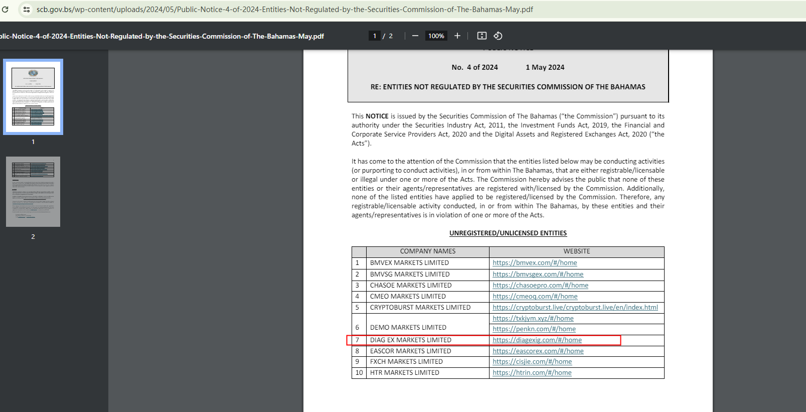 Similarly, Diag EX's claimed authorization from the Securities Commission of the Bahamas (SCB) has been refuted by the SCB itself. This entity is on the SCB's warning list.