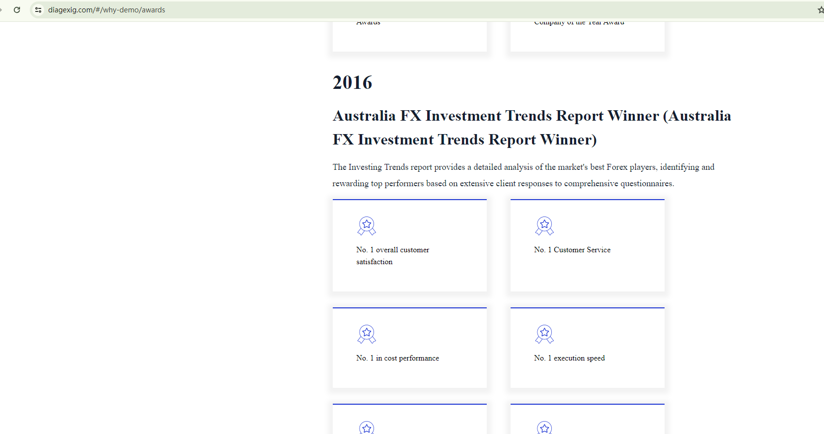 Diag EX's website bears a striking resemblance in content to that of DEMO, a scam broker previously flagged by BrokersView. This is particularly evident in the alleged physical address, registration information, brand's age, and the purported awards. This is a significant indicator of a scam.