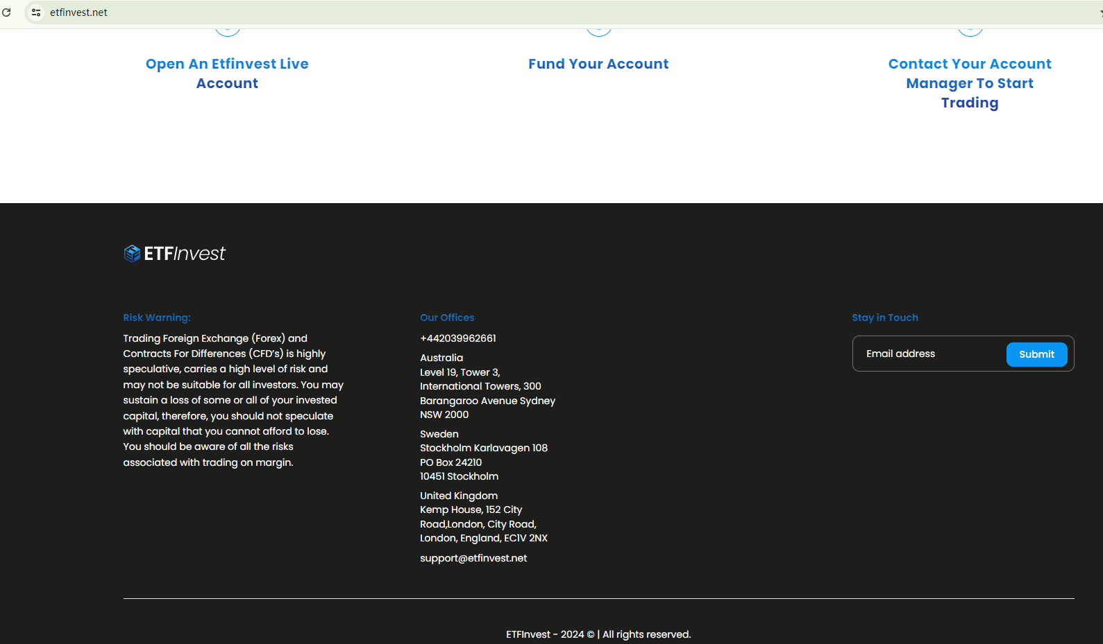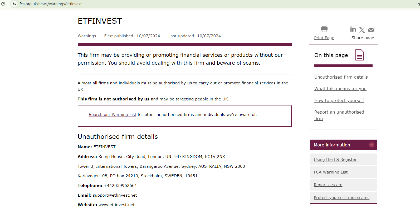 In addition, the Financial Conduct Authority (FCA) has issued a warning against ETFINVEST, believing this company might be providing financial services or products without proper authorization in the UK.