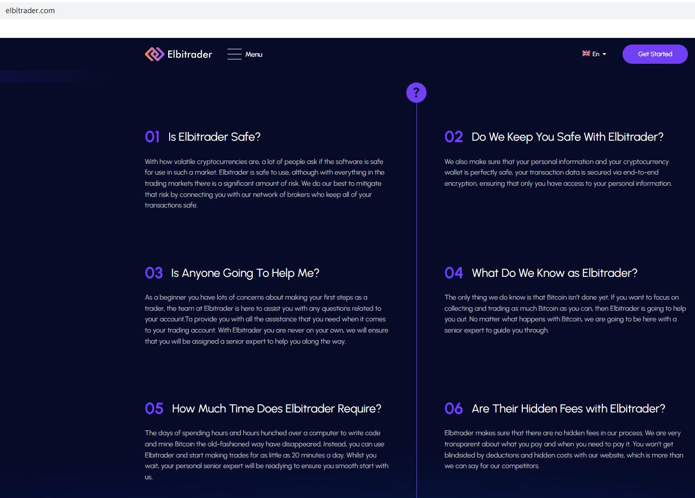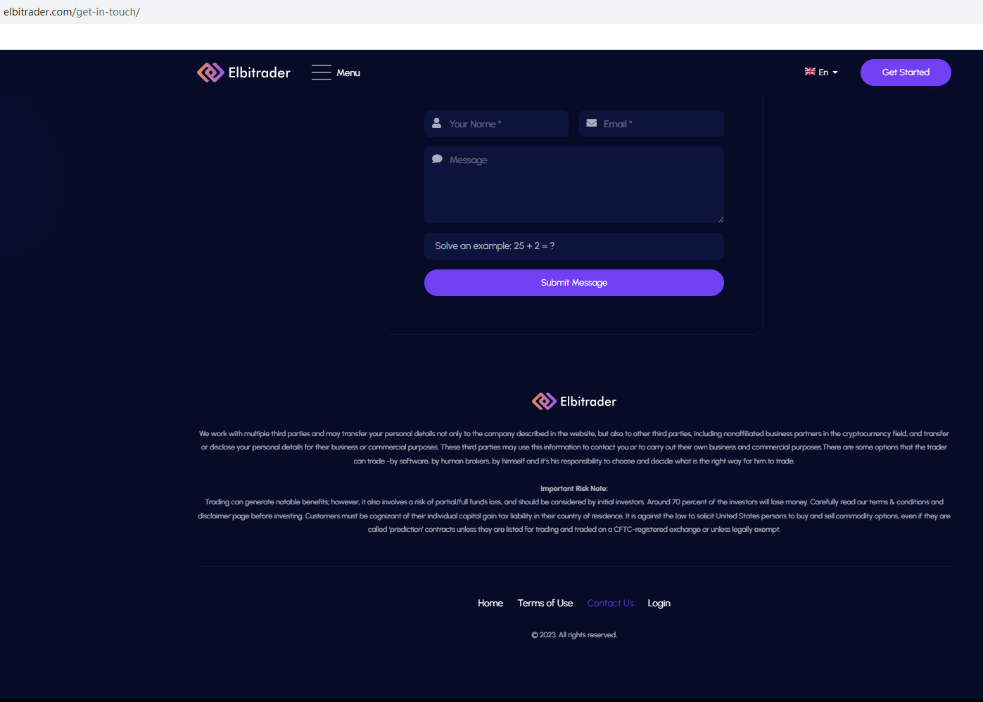 Elbitrader claims to be a reliable company without presenting any information about its regulation or contact. The lack of such important information may be a distinct signal of an unlicensed broker, as regulated companies always present their accreditations and licenses in a prominent position. It is a red flag.