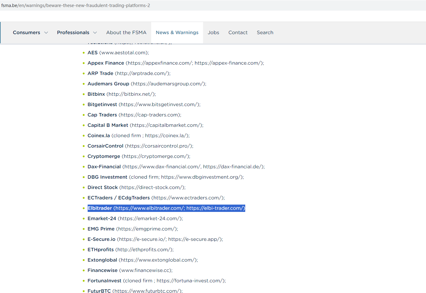 On 30 November 2023, the Financial Services and Markets Authority (FSMA) issued a warning that Elbitrader was providing financial services or products without authorisation. You may visit: https://www.fsma.be/en/warnings/beware-these-new-fraudulent-trading-platforms-2
