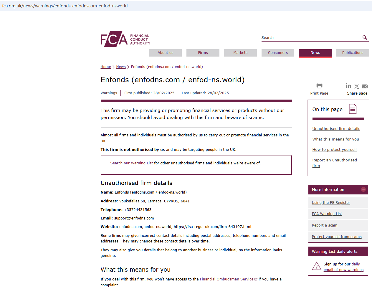 • Feb 27, 2025 The FCA issues a warning against Enfonds