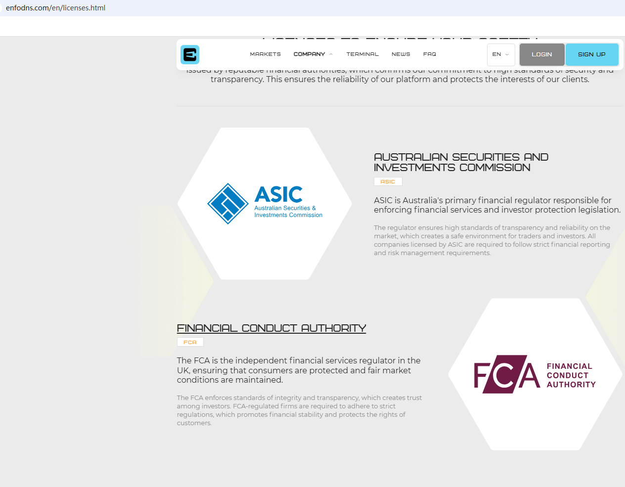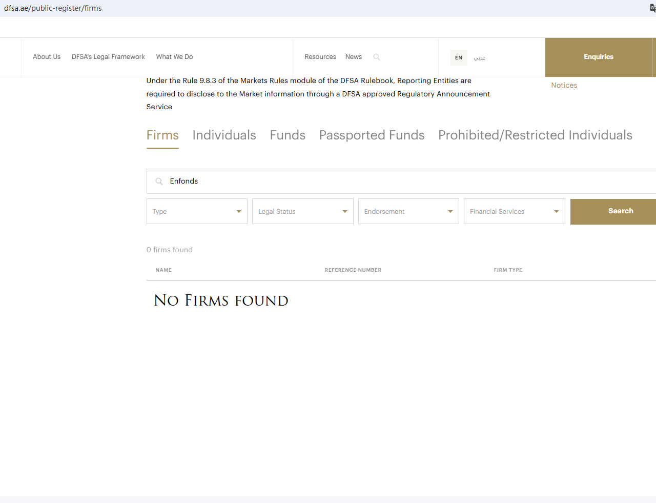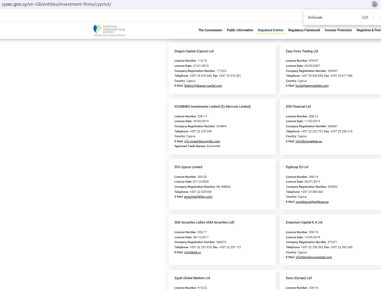 According to its website, it claims to be regulated by numerous regulatory bodies. Upon investigation, no matching information was found in the Australia Securities & Investment Commission (ASIC), Dubai Financial Services Authority (DFSA) and Cyprus Securities and Exchange Commission (CySEC). In addition, The Financial Conduct Authority (FCA) has issued a warning against Enfonds, refuting the firm's claims of being regulated in the UK. In essence, Enfonds is not regulated by any governing body. Entrusting it with investors' funds is highly risky, as there are no legal protections in place to safeguard the funds. Enfonds appears to be a scam.