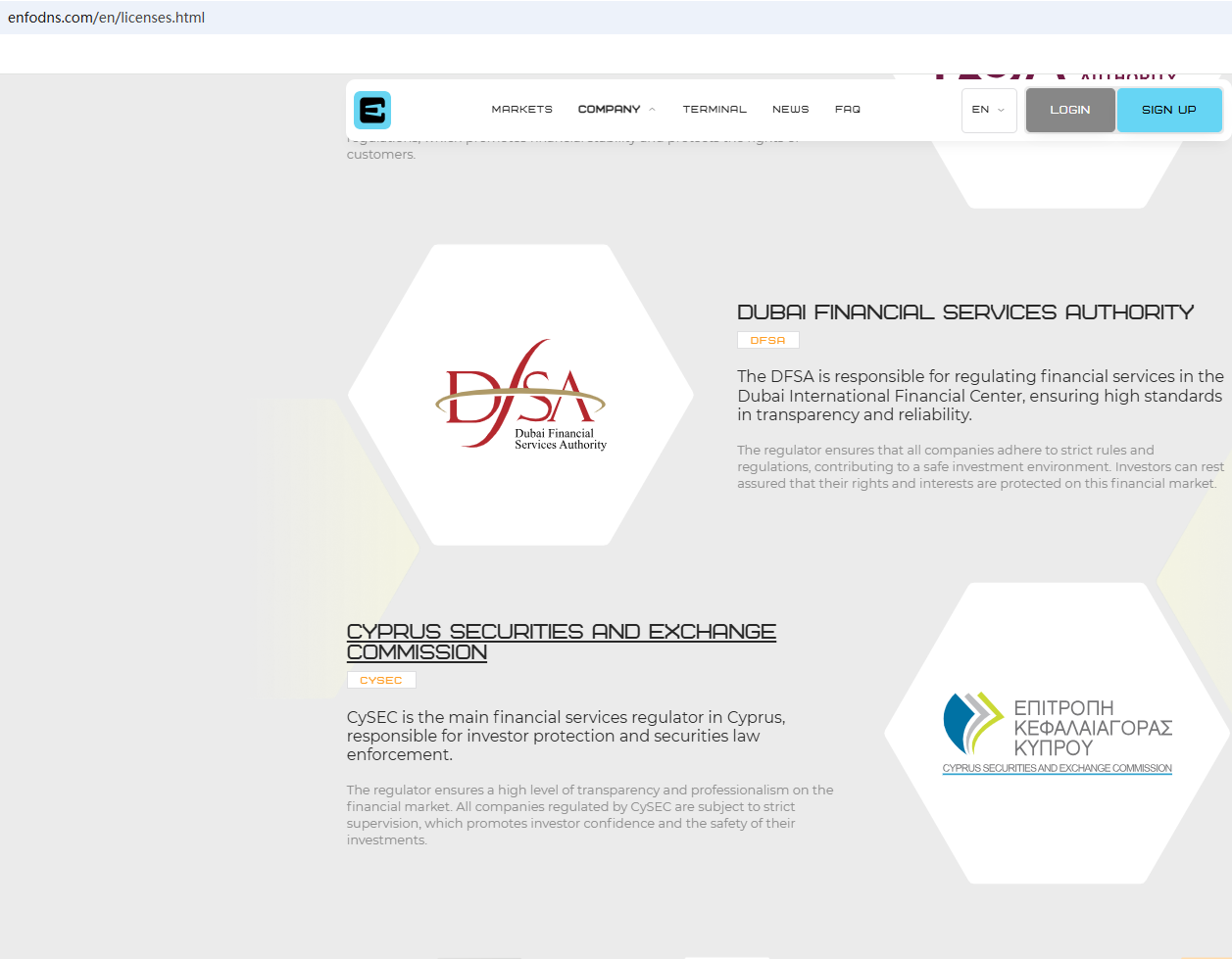 According to its website, it claims to be regulated by numerous regulatory bodies. Upon investigation, no matching information was found in the Australia Securities & Investment Commission (ASIC), Dubai Financial Services Authority (DFSA) and Cyprus Securities and Exchange Commission (CySEC). In addition, The Financial Conduct Authority (FCA) has issued a warning against Enfonds, refuting the firm's claims of being regulated in the UK.