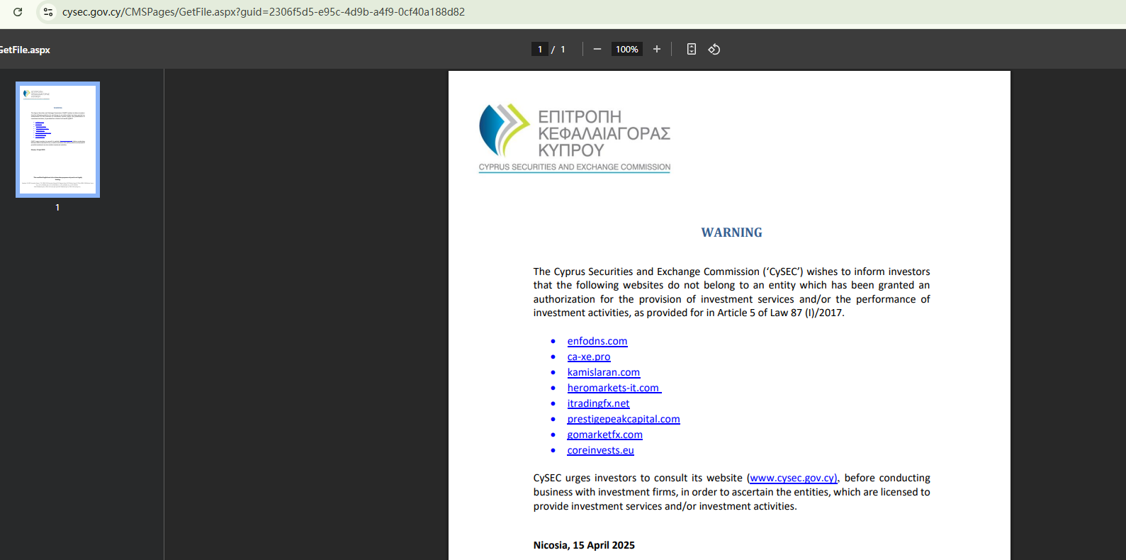 • Apr 14, 2025 The CySEC adds Enfonds to its warning list