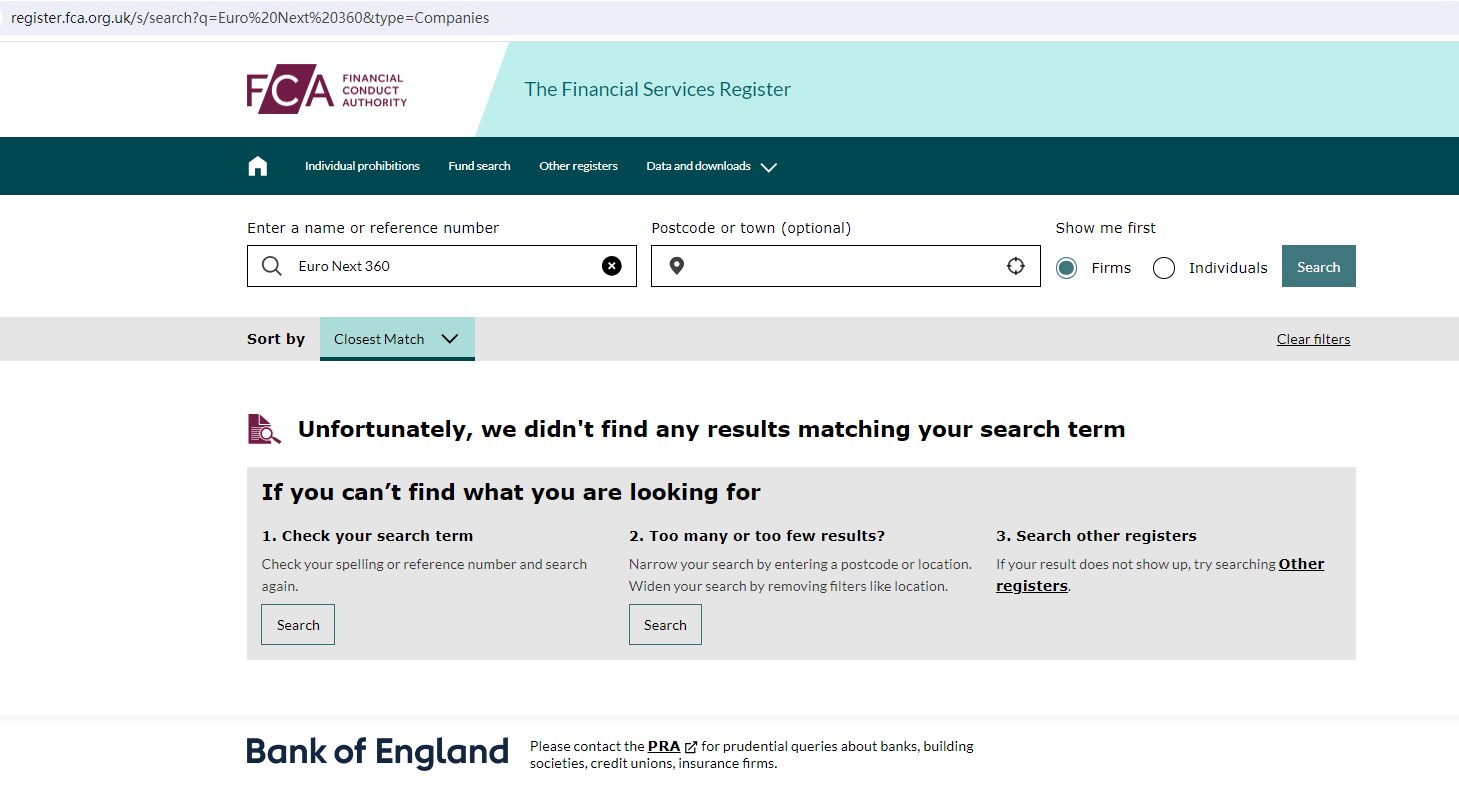Upon investigation, we found that Euro Next 360 is not regulated by the United Kingdom Financial Conduct Authority (FCA), the Swiss Financial Market Supervisory Authority (FINMA), the Monetary Authority of Singapore (MAS).
