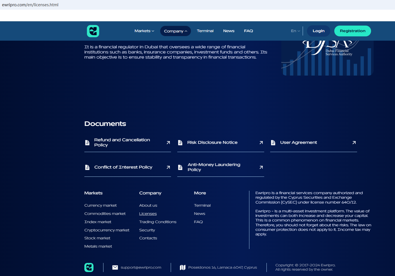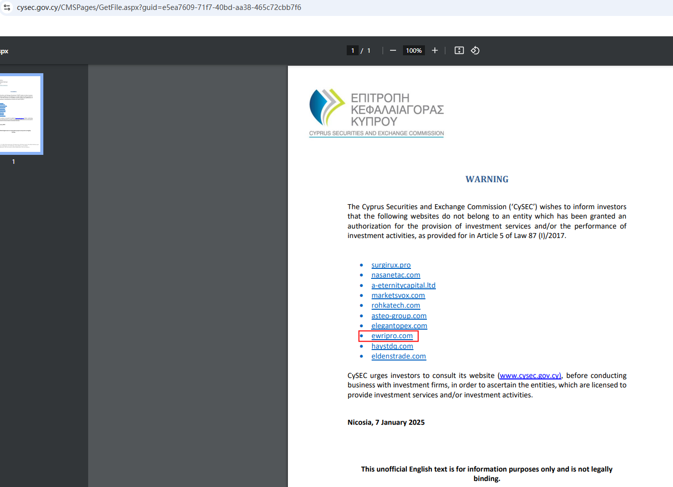 In addition, the Cyprus Securities and Exchange Commission (CySEC) issued a warning against Ewripro, believing this company might be providing financial services or products without authorisation.