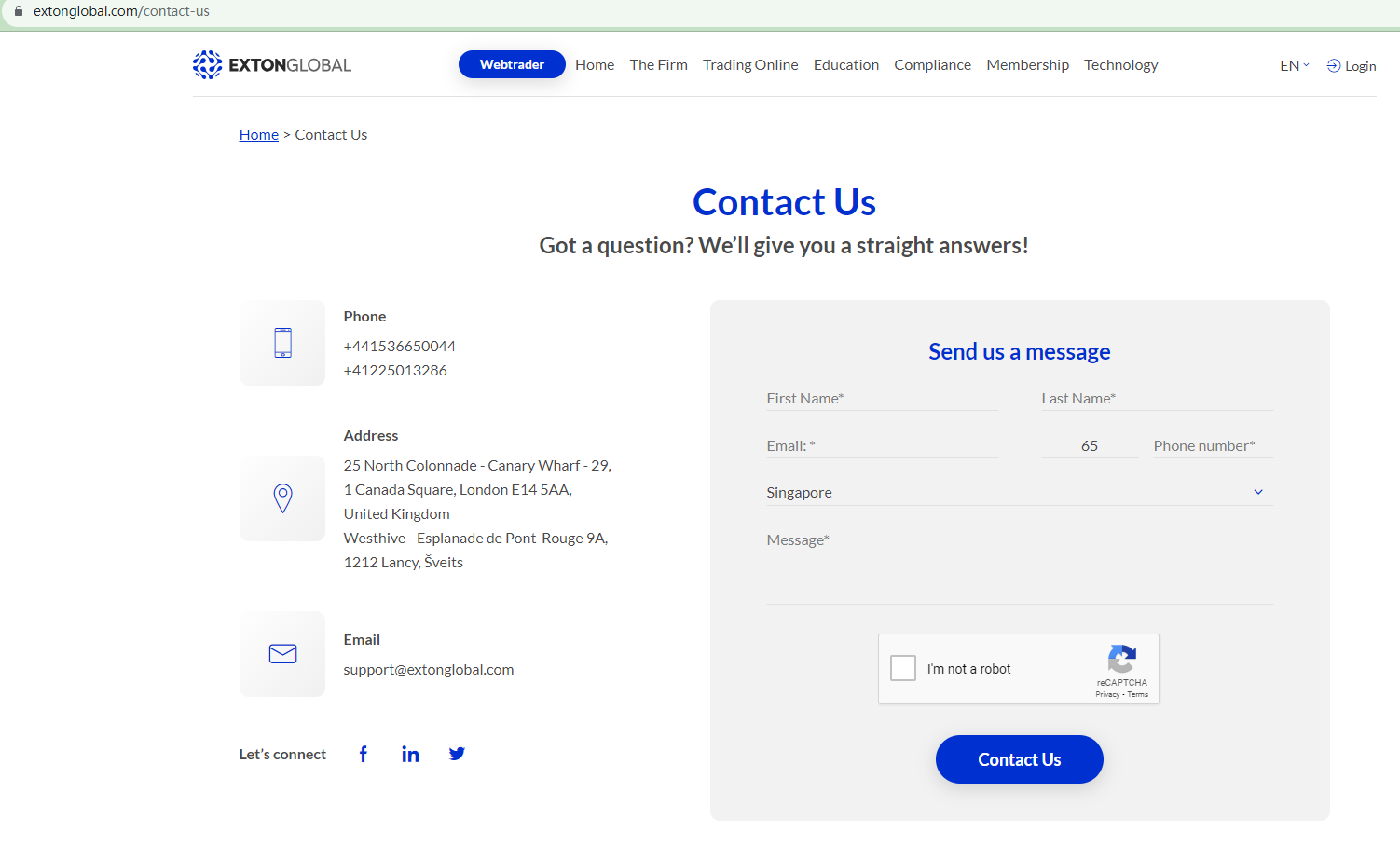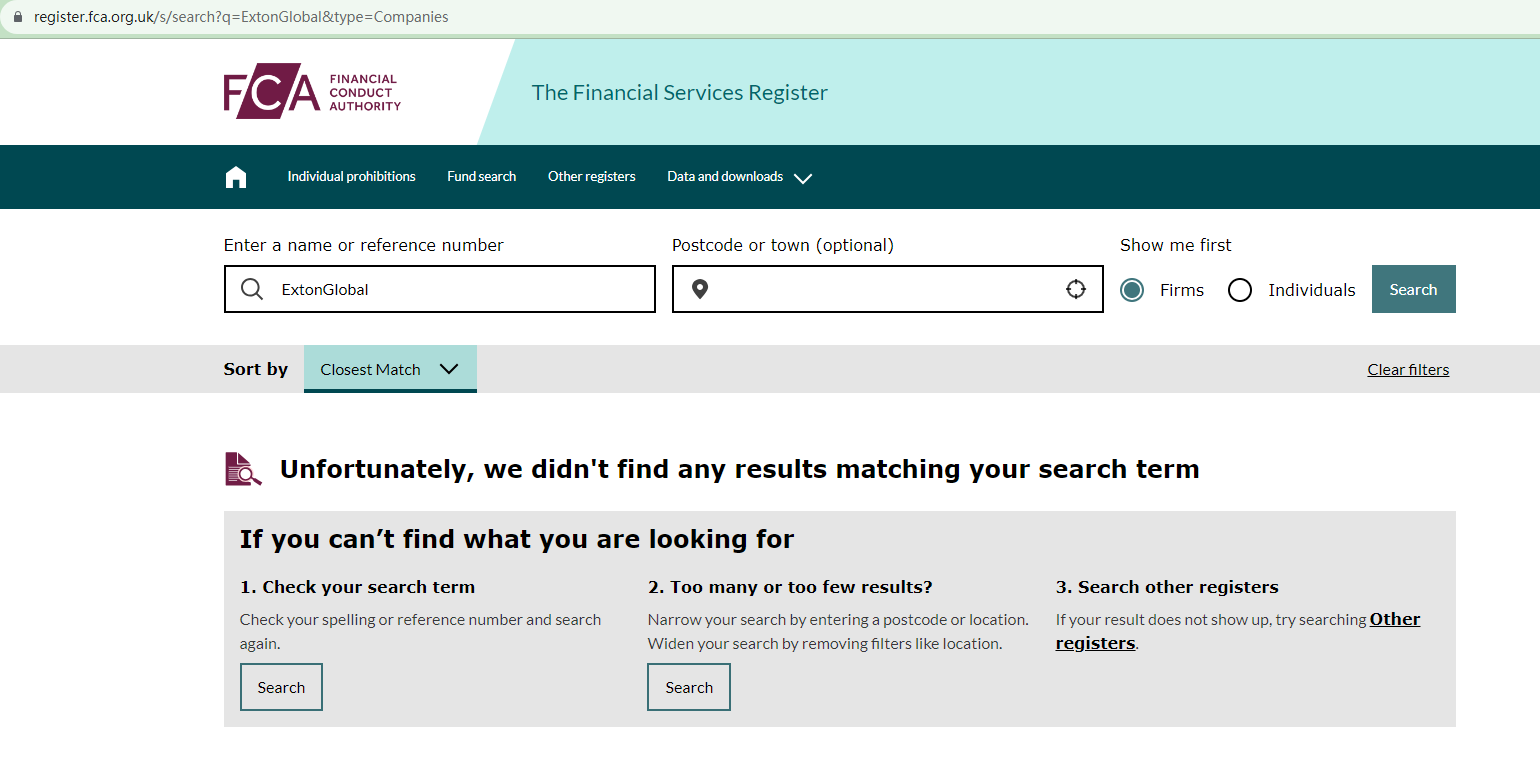 ExtonGlobal lists two addresses on its website, one in the UK and the other in Switzerland, purporting to be its office locations. We conducted a search in the registers of the Financial Conduct Authority (FCA) and the Swiss Financial Market Supervisory Authority (FINMA). However, we found no official data to support its legitimacy within these two countries, rendering its operations unlawful.