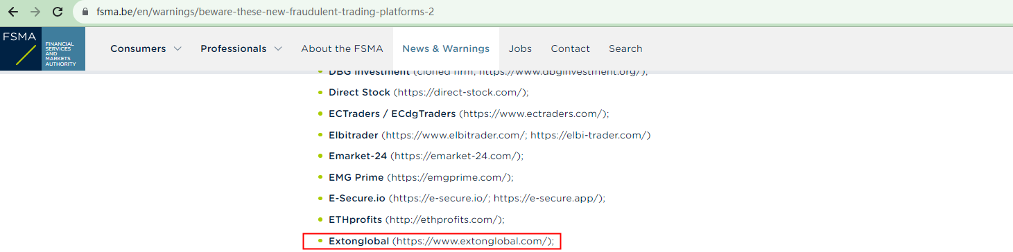On November 30, 2023, the Belgian Financial Services and Markets Authority (FSMA) added ExtonGlobal to its warning list as a fraudulent trading platform operating in the Belgian market. https://www.fsma.be/en/warnings/beware-these-new-fraudulent-trading-platforms-2
