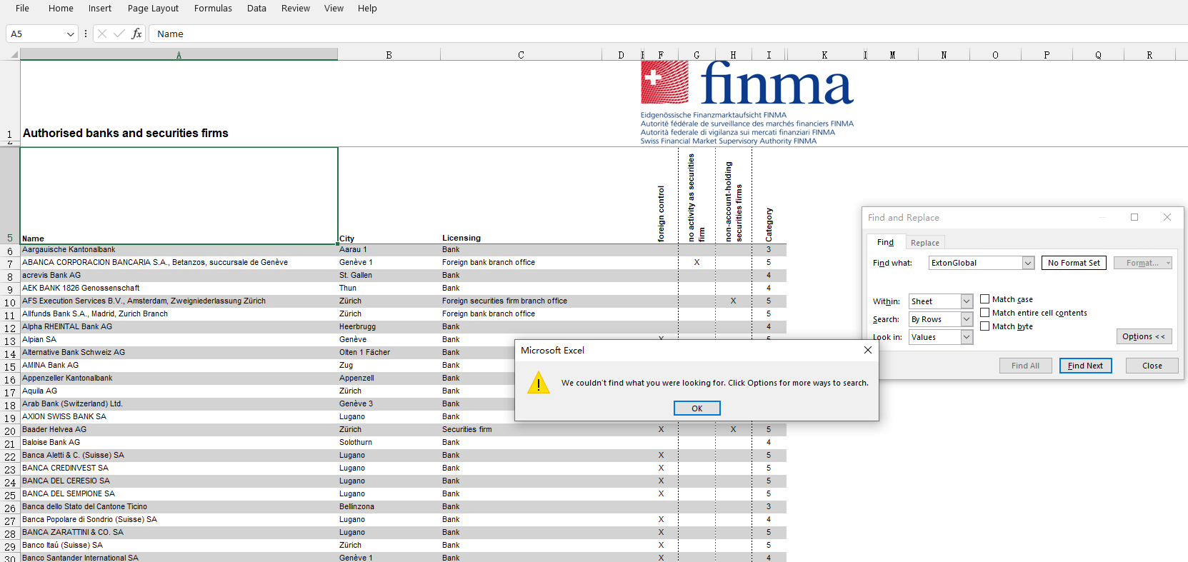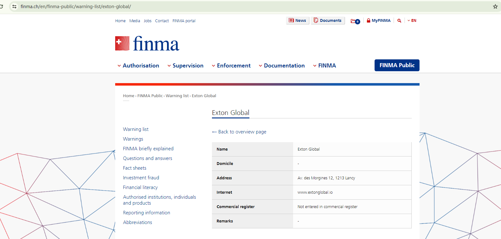• 2024-05-09 The Swiss FINMA issues a warning against ExtonGlobal