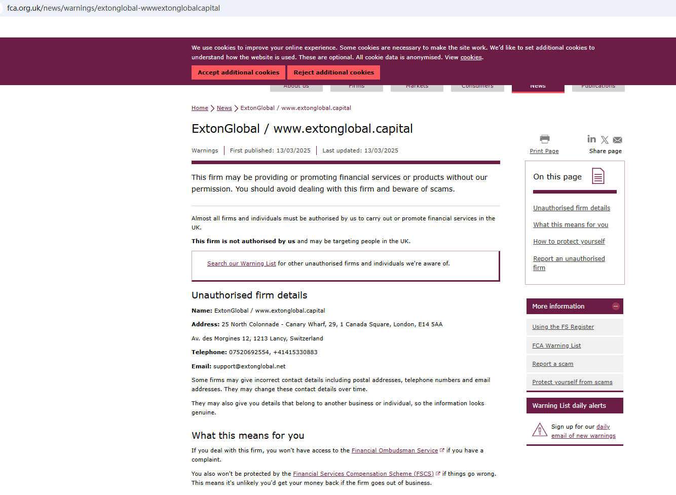 • 2025-03-12 The FCA adds ExtonGlobal to its warning list