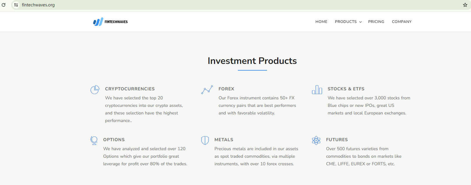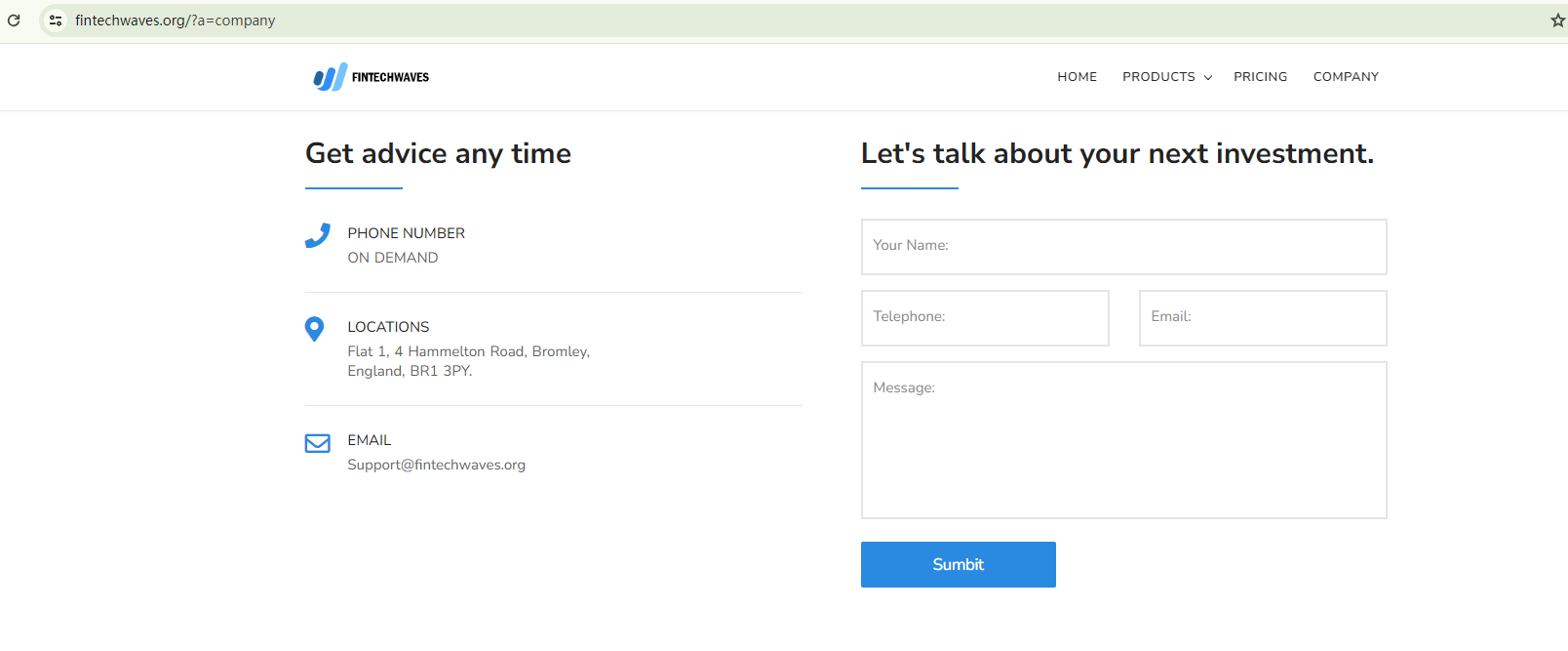 FINTECHWAVES claims to be an investment company headquartered in the UK. As per UK law, almost all individuals and firms are required to obtain authorization from the Financial Conduct Authority (FCA). However, there are no indications that it is registered with the FCA and the UK's financial regulator has issued a warning against FINTECHWAVES, flagging it as an unauthorized firm and advising investors to stay away from the scam.