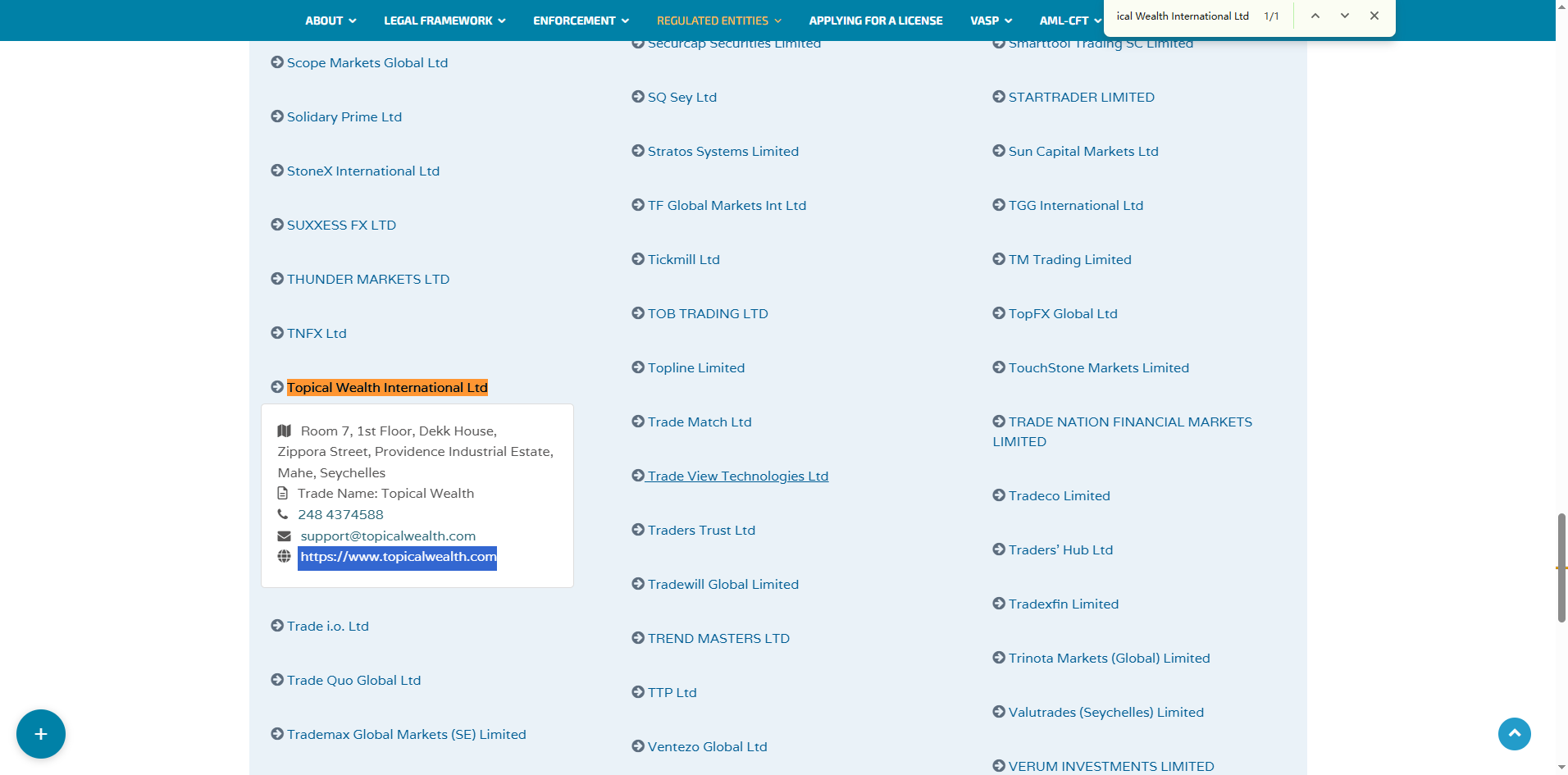 The platform also claims affiliation with Topical Wealth International Ltd, licensed by the Seychelles FSA. However, official records confirm that the authorized trading name is "Topical Wealth" and the approved domain is https://www.topicalwealth.com.