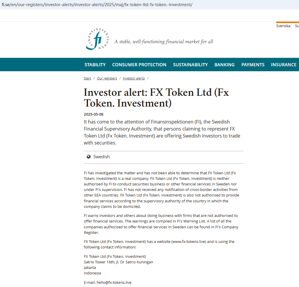 In addition, the Finansinspektionen (FI) issued a warning against FX Token Ltd, suspecting that it is not a real company.