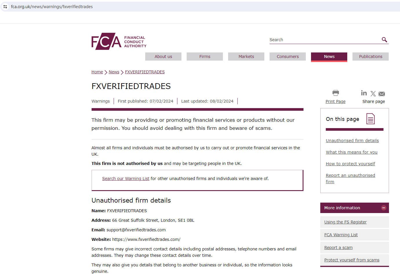 In addition, the United Kingdom Financial Conduct Authority (UK FCA) issued a warning that FXVERIFIEDTRADES was providing financial services or products in the UK without authorisation.