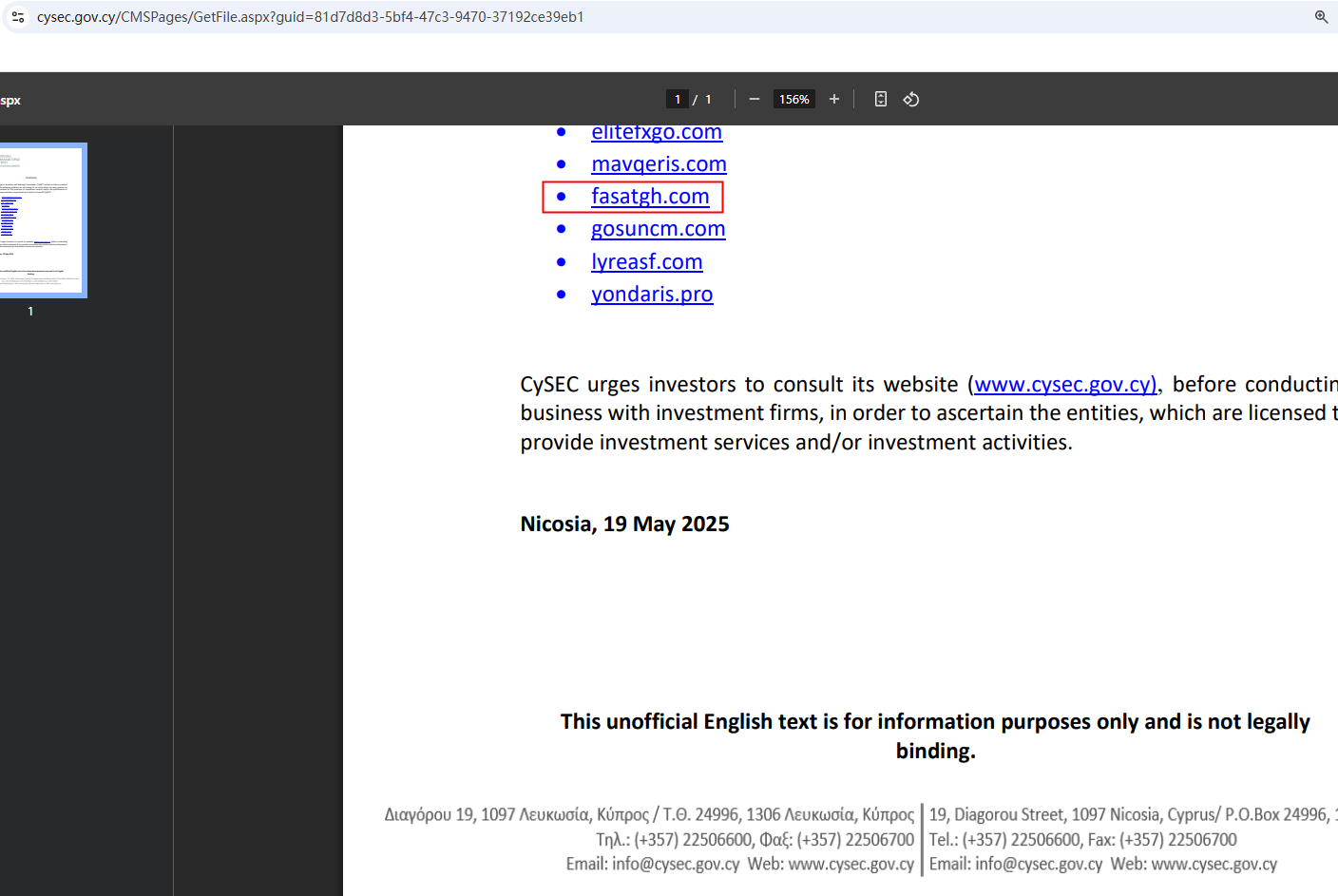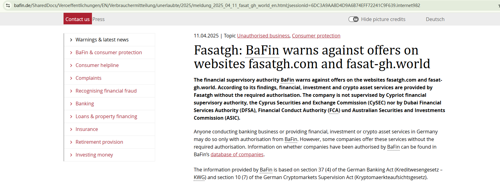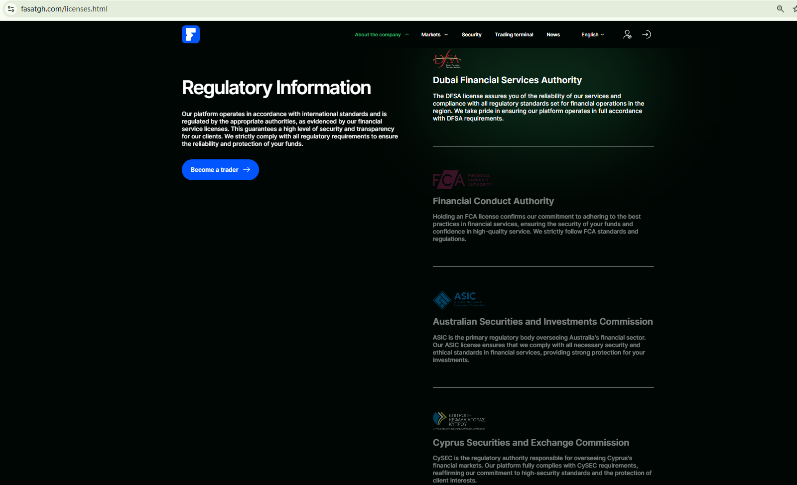 Fasatgh falsely claims to be regulated by the Dubai Financial Services Authority (DFSA), the Financial Conduct Authority (FCA), the Australian Securities and Investments Commission (ASIC), and the Cyprus Securities and Exchange Commission (CySEC). The Federal Financial Supervisory Authority (BaFin) has issued a warning, stating that the broker is not regulated by any of the aforementioned authorities. This warning indicates that Fasatgh is unlicensed and potentially fraudulent.